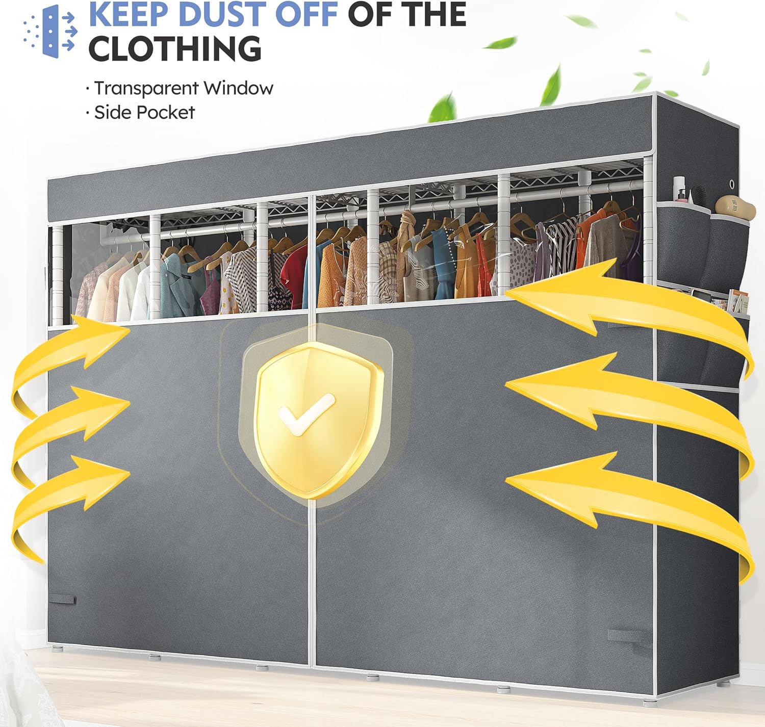 - 【Garment Rack with Zippered Cover】This covered clothing rack comes with zippered oxford fabric cover provides a stylish and protective barrier for clothes, that is easy to clean with damp cloth, the zipper design not only makes store items easy but also keeps items away from dust and moisture-proof and provides more private space while maintaining a neat appearance. 2 Side pockets for storing more sundries. The visible transparent window on the dust cover allows you to quickly determine the hanging position of the clothing and retrieve it