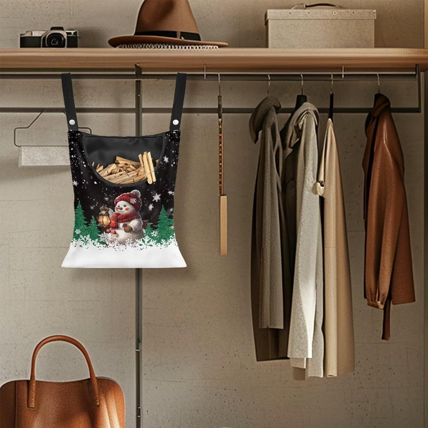 Snowman Clothes Pin Hanging Bag, Large Capacity Clothespin Bag with A Large Opening,Clothes Pin Hanging Bag Space-Saving Organize Clothespin Bag for Clothesline Outdoor