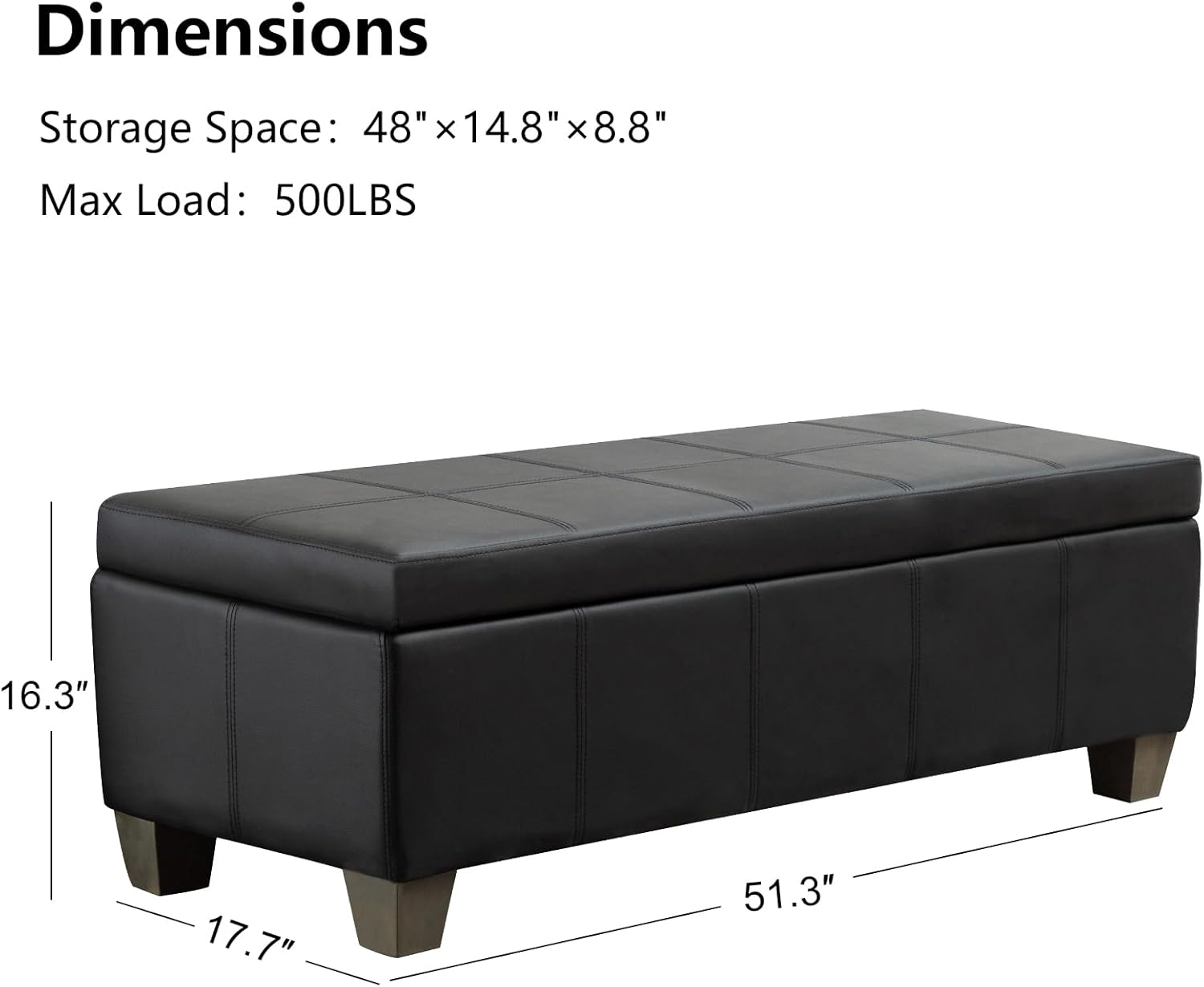51 Inch Black Faux Leather Ottoman with Storage, Rectangular Extra Long Bench, End of Bed Bench with Large Storage for Bedroom, Living Room
