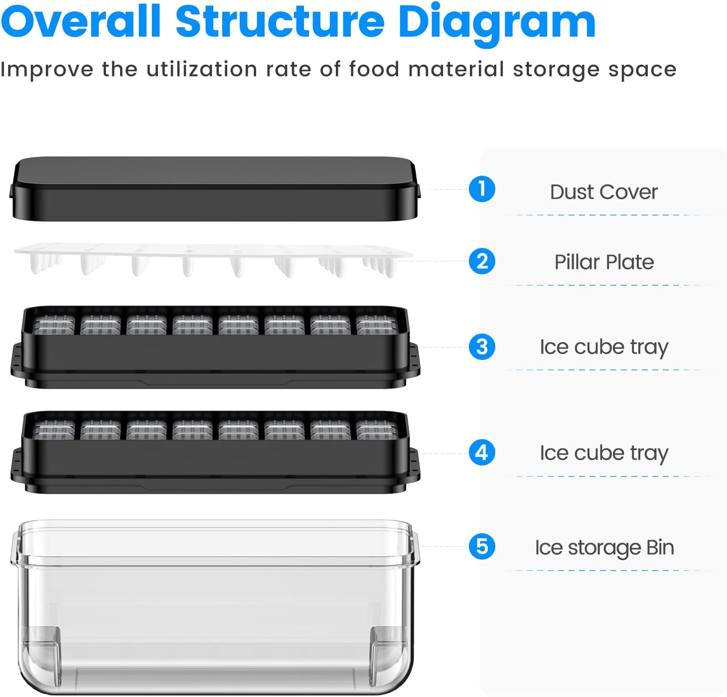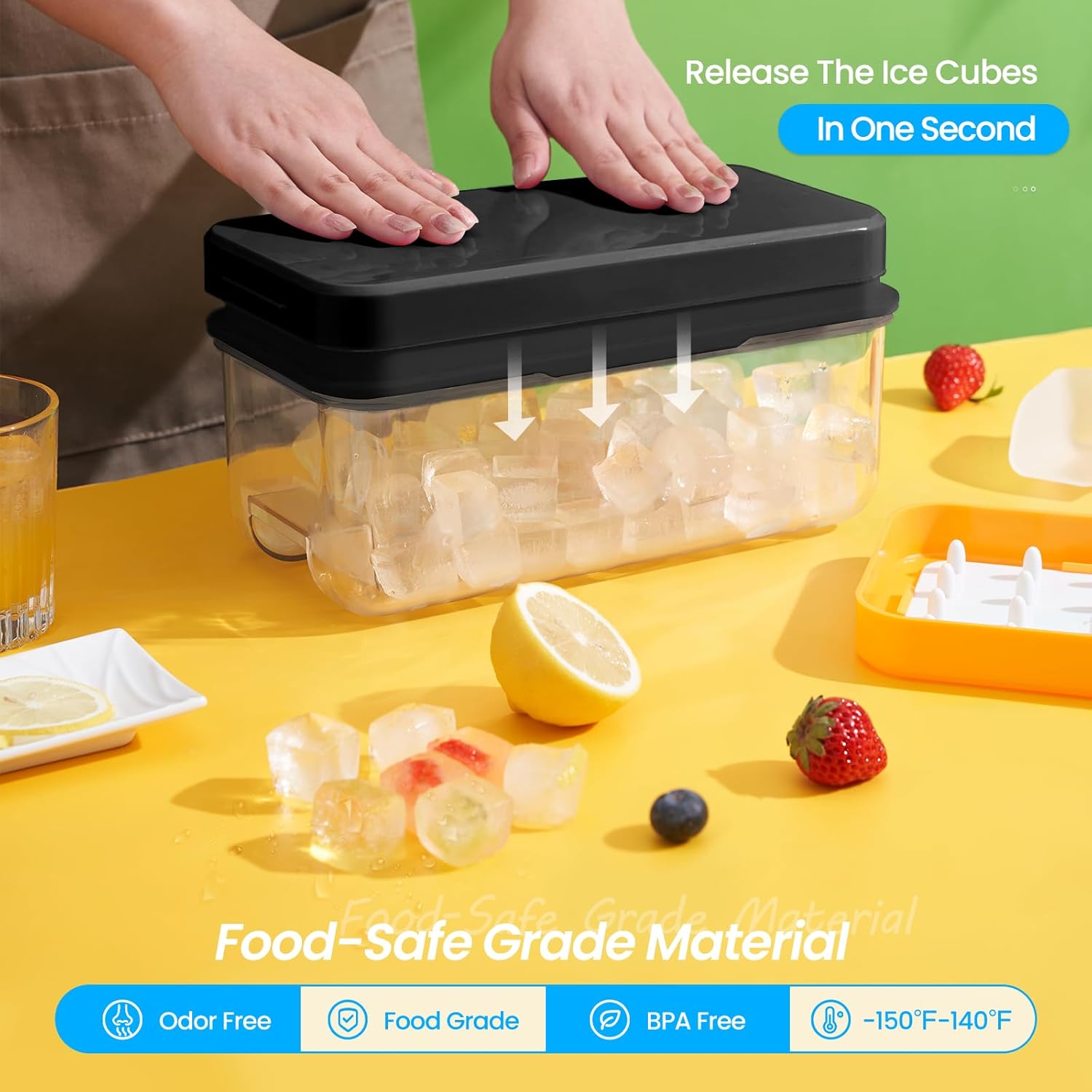 Ice Cube Tray with Lid and Bin, PHINOX 64 pcs Ice Trays for Freezer, Ice Cube Trays for Freezer with 2 trays, Container, Lid & Ice Scoop, BPA Free, Black