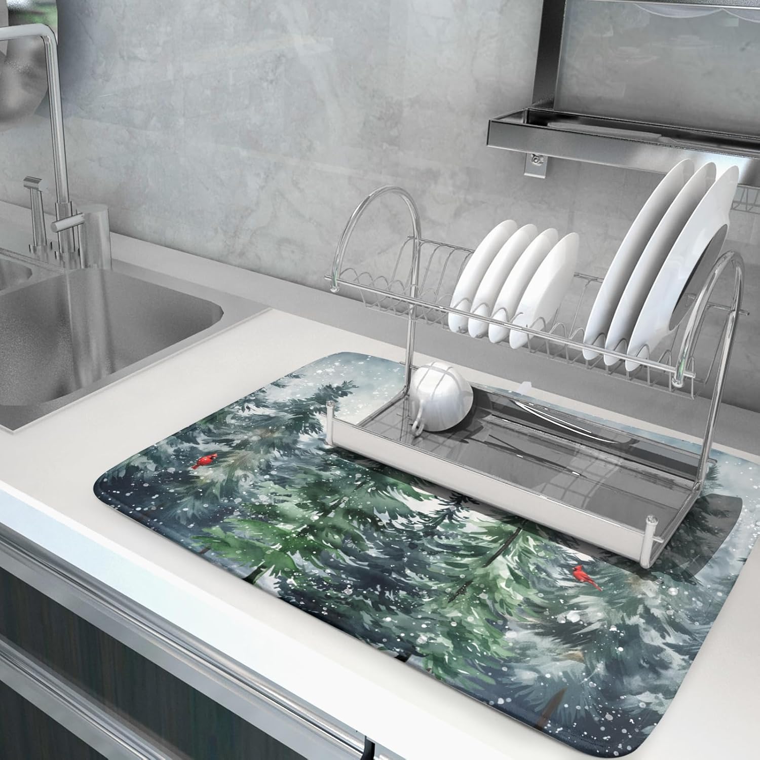 - 【Fashion Design】Our christmas drying mat for kitchen counter is customized with single-sided printing, one side is takes christmas as theme, printed with winter green pine trees, snowflakes and red cardinal bird pattern, does not fade, perfect functional addition to your kitchen decor, fitting well and tightly on most counters. Prepare the best holiday present for family and friend, housewarming parties, weddings, birthdays, Halloween, Christmas and Thanksgiving Day.