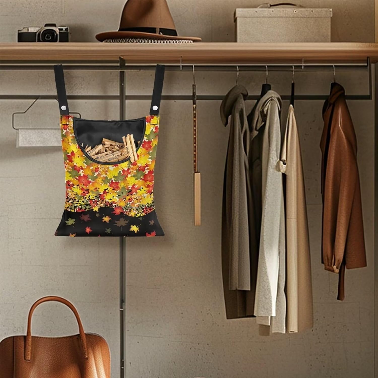 Maple Leaf Handy Laundry Clothespin Bag Holds 100 Medium-Sized Clothes Pins, Music Notes Waterproof Polyester Material, 2 Ropes for Hanging and Effortlessly Sliding on Clothesline