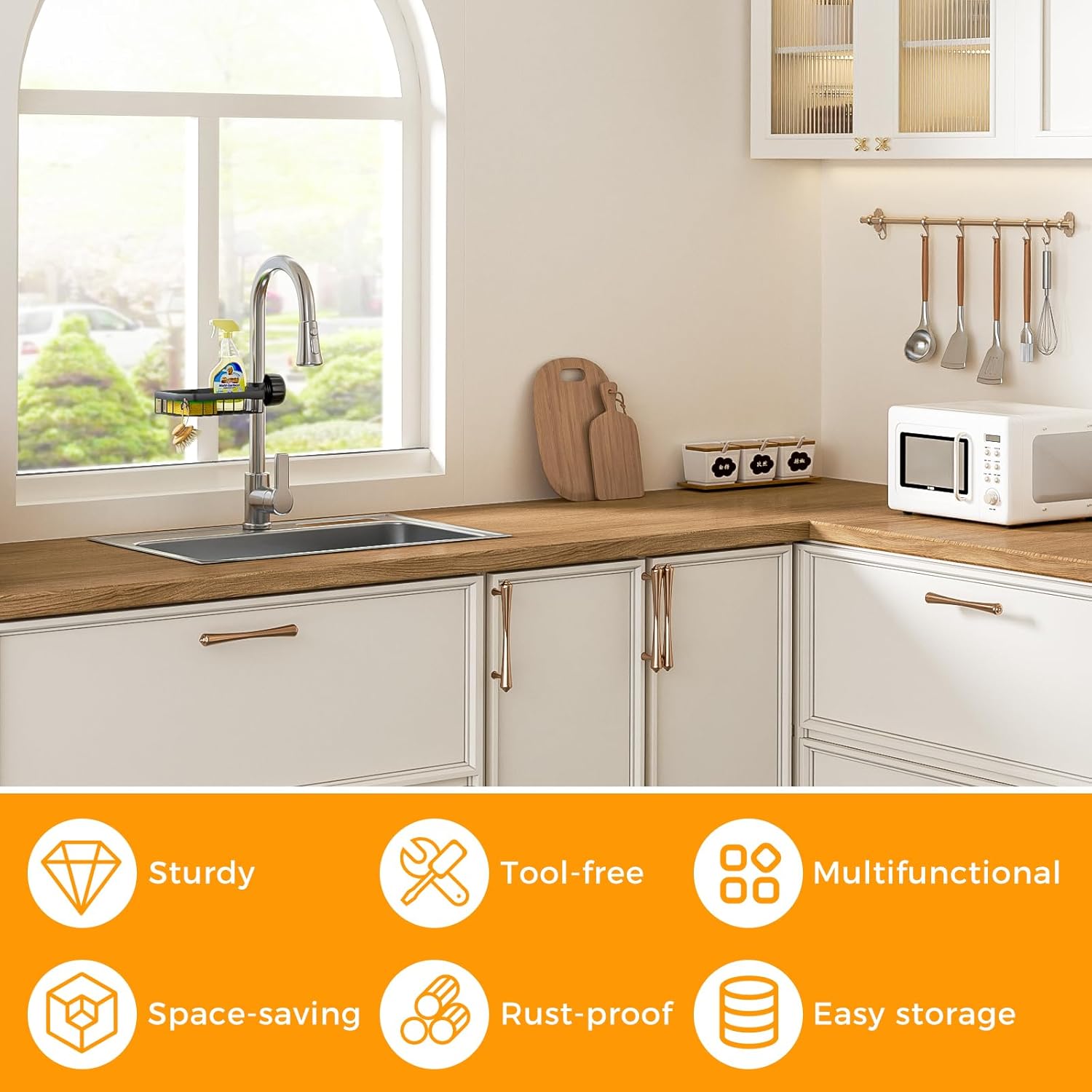 - Multi-functional Design: Our innovative stainless steel kitchen faucet organizer rack isn't just a sponge holder—it also serves as a dish brush stand, soap storage, and more. it fits perfectly over a variety of kitchen faucet sizes.