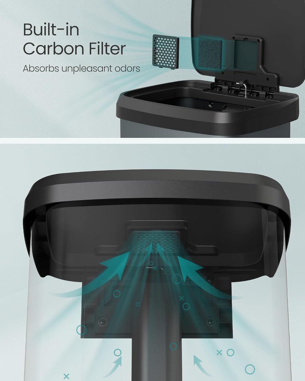 - [Thoughtful Detailing] The carbon filter in the lid helps absorb unpleasant odors, keeping your kitchen smelling fresh. Included are 15 liner bags (16-18 gallons) that perfectly fit this kitchen can
