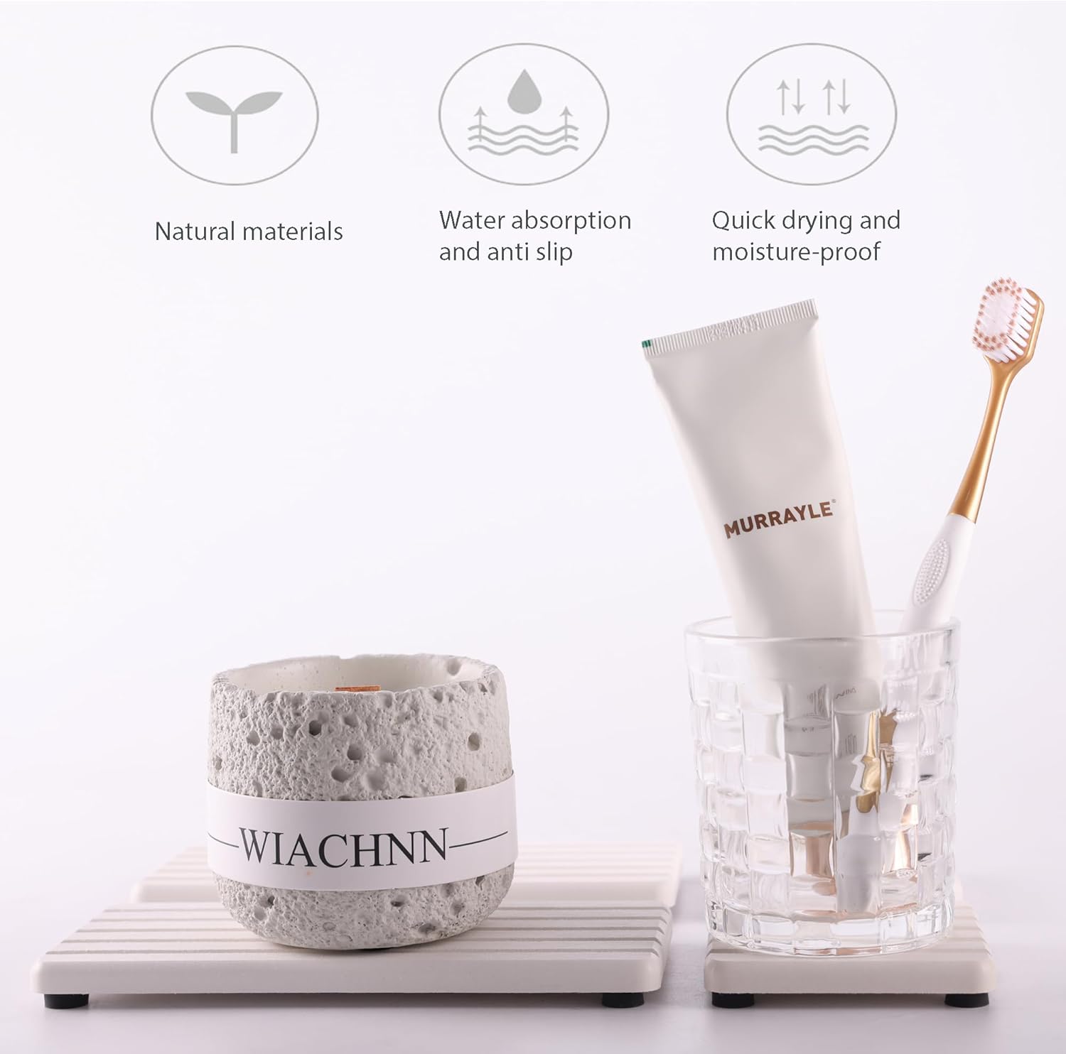 - Striped ditch design speeds up the absorption and volatilization of water, and has anti-skid effect.Silicone footpads boost the slip-resistance of coasters while keeping them out of the bathroom vanity. This design improves the contact surface between the diatomaceous earth coaster and the air, prevents moisture, and prolongs the service life of the product.