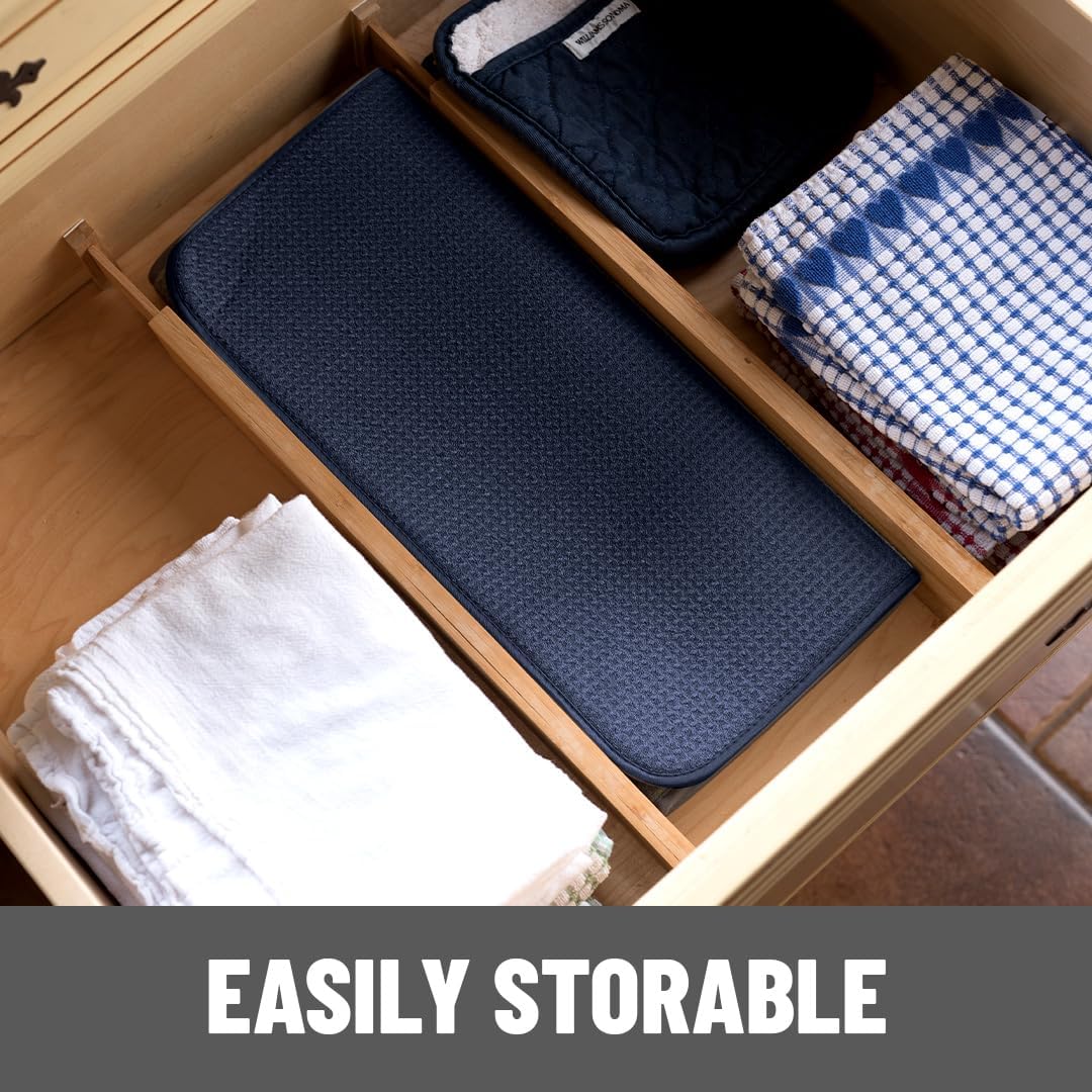 - THICKEST , STYLISH MAT | INNOVATIVE HONEYCOMB WEAVE: Keep your counter spotless even while washing a sink full of kitchen dishes . Our superbly stylish drying mat is among the thickest on the market today , and its innovative honeycomb microfiber structure enhances absorption and quickens drying time . Idea kitchen accessories for countertop