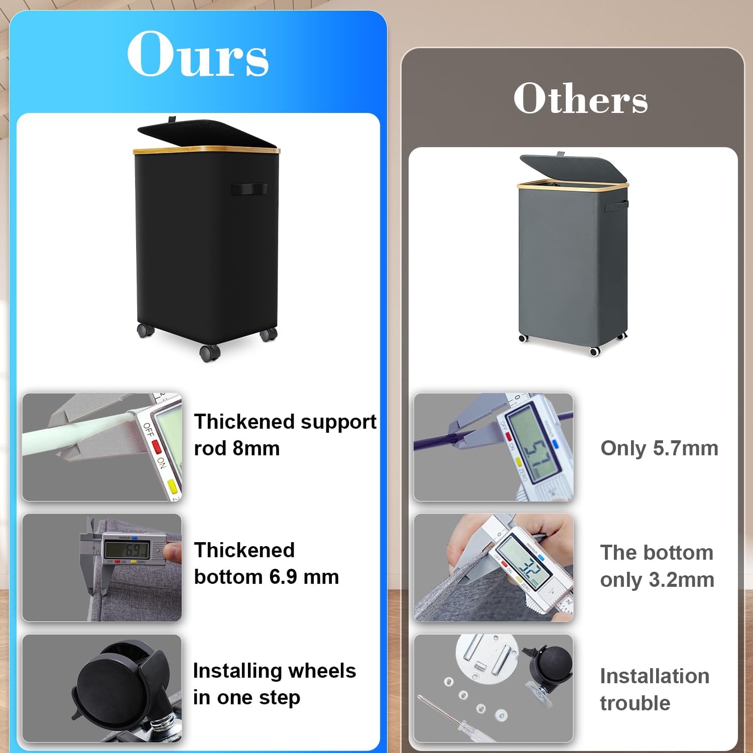 Laundry Hamper with Wheels,20 Gal (75L) Laundry Basket with lid Rolling Clothes Hamper Foldable Dirty Clothes Basket on wheels with Bamboo Frame and Bag for Bedroom, Dorm, Laundry Room-Black