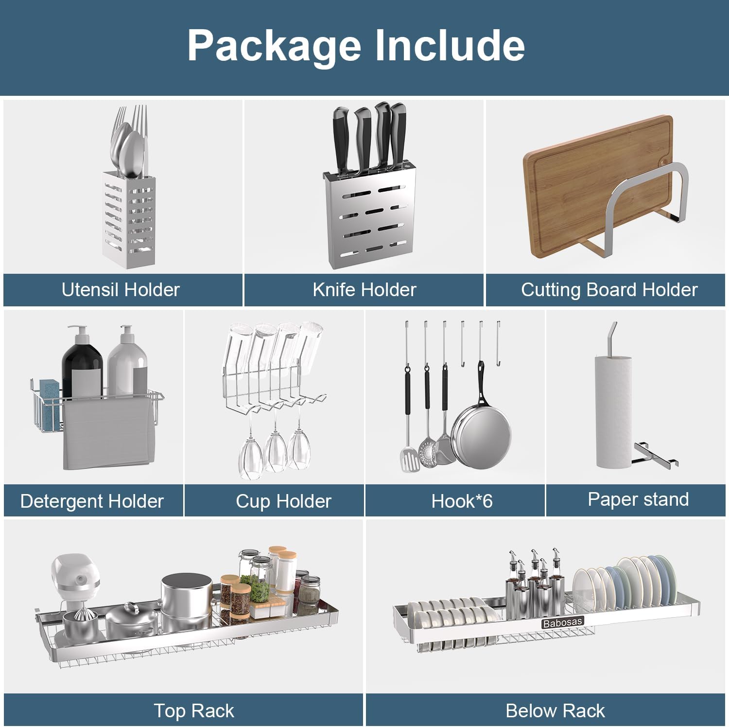 - Measure The Size Before Purchase: It is important to accurately measure three values before your order: the width of the space where the kitchen sink is located, the height of the faucet, and the distance between the bottom of the cabinet and the countertop. Babosas provide lifetime after-sales service for this large kitchen sink dish drying rack. Add to your cart now, then you will have a perfect over sink dish drainer for your kitchen