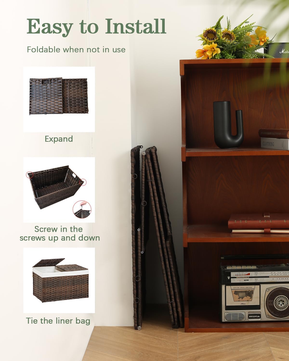 - Easy to Assemble: Large wicker basket is made of PE rattan, wicker hamper with lid is easy to assemble, if you decide to stop using wicker storage baskets you can fold woven hamper with lid up for storing woven basket with lid more compactly.