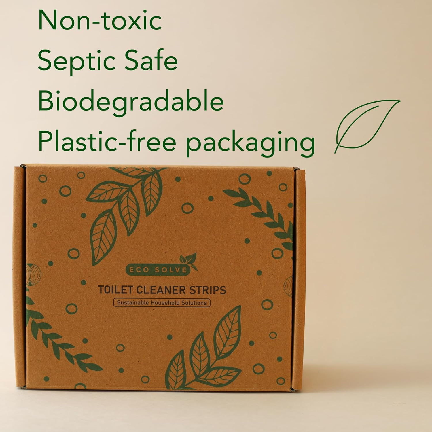 - 💧QUICK & EASY CLEANING: Our toilet cleaner strips are made using an all-natural, concentrated cleaning formula. Simply place a strip into your toilet bowl, wait 60 seconds for the strip to dissolve, scrub the toilet bowl thoroughly, and flush! NO splashing, NO squirting, NO mess! Eco Solve toilet cleaning strips will remove stains and deodorize your toilet bowl.