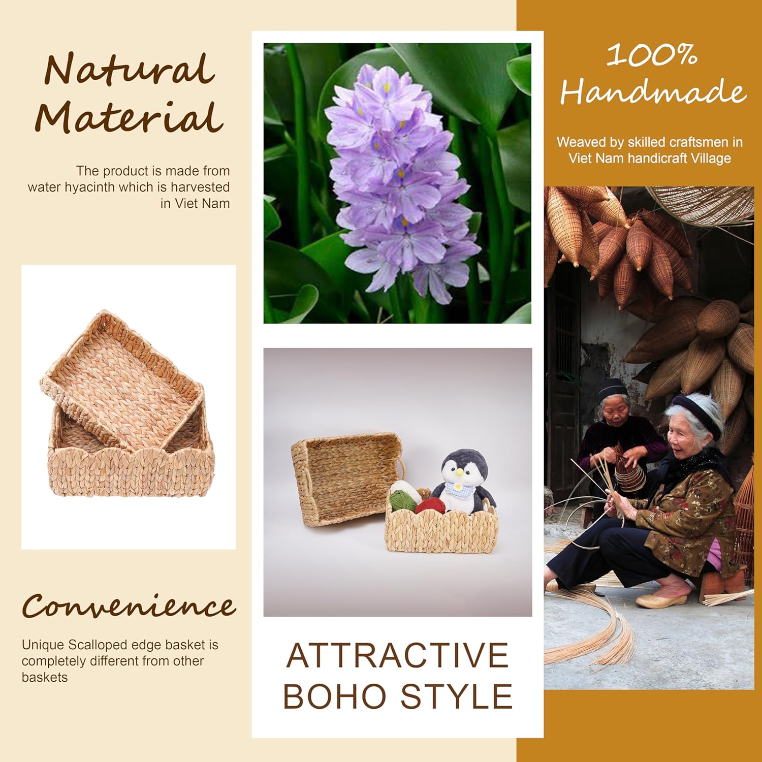 - 🎯 【Detail】: Wicker storage basket is handmade by skilled craftsmen using material natural water hyacinth, so each scalloped edge basket with built-in handles is unique. The woven basket strong and built to last, so that they'll keep their shape and stay reliable over time, making them even more valuable.
