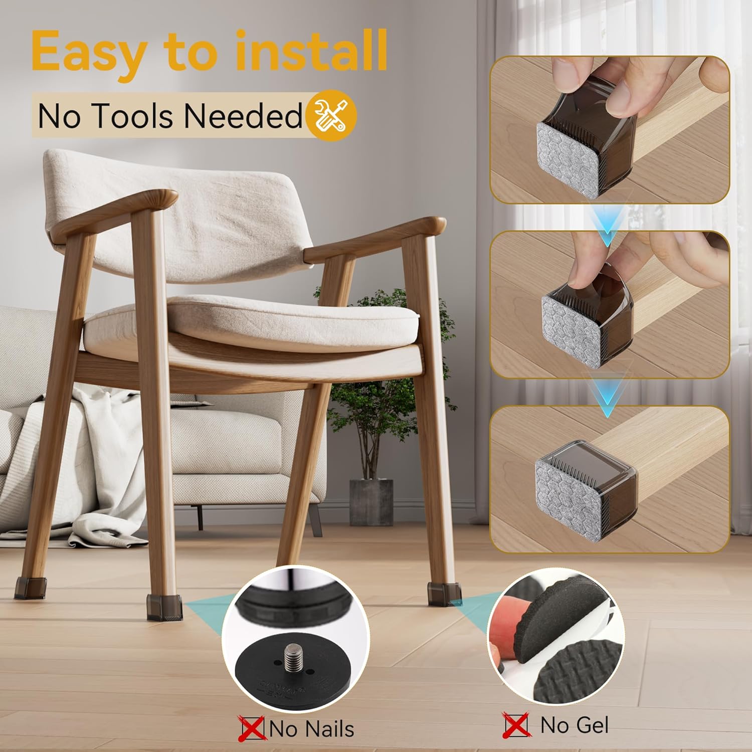 - ✅【Easy to Use】The furniture leg protectors are easy to install, without the use of tools. You just need to slip the chair leg protectors for hardwood floors over the bottoms of the chair legs. Easy to put on and take off. Much better than the felt or ones that have to be nailed on! Mainly suitable for smooth floors such as hardwood, tile, composite floor, and vinyl floor. Cap style match with most floors.