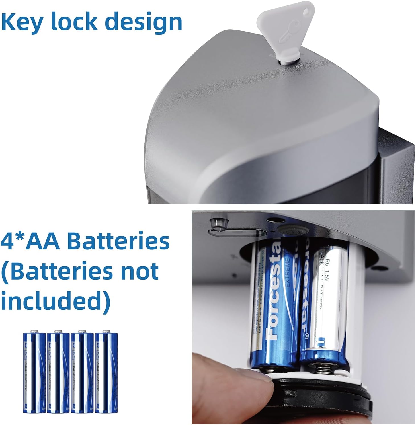 - 3-Level Adjustable Soap Output Volume: Our automatic soap dispenser has 3 different liquid soap volume settings, which allows you to set your desired volume easily. Long press the button at the bottom of the hand soap dispenser to switch power on/off, and short press to switch the soap level. This sensor soap dispenser pump uses 4 AA Alkaline batteries (batteries not included).