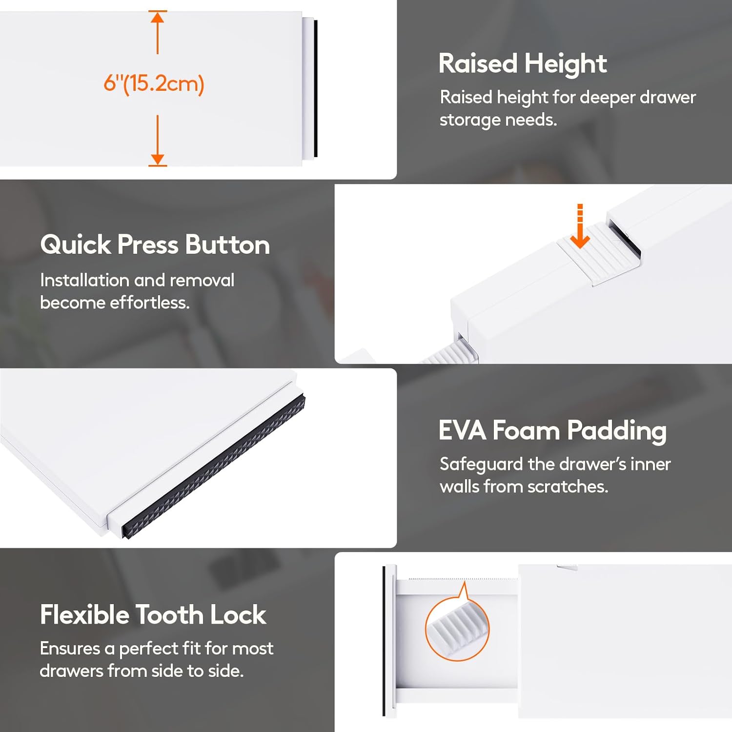 - Sturdy Construction: Made of robust ABS material, our dresser organizer features EVA foam sponges on the ends to prevent scratches and damage to your drawerโs interior, ensuring a clean and stable fit without residue; Our divider is patented (Patent No: US12133593B2)