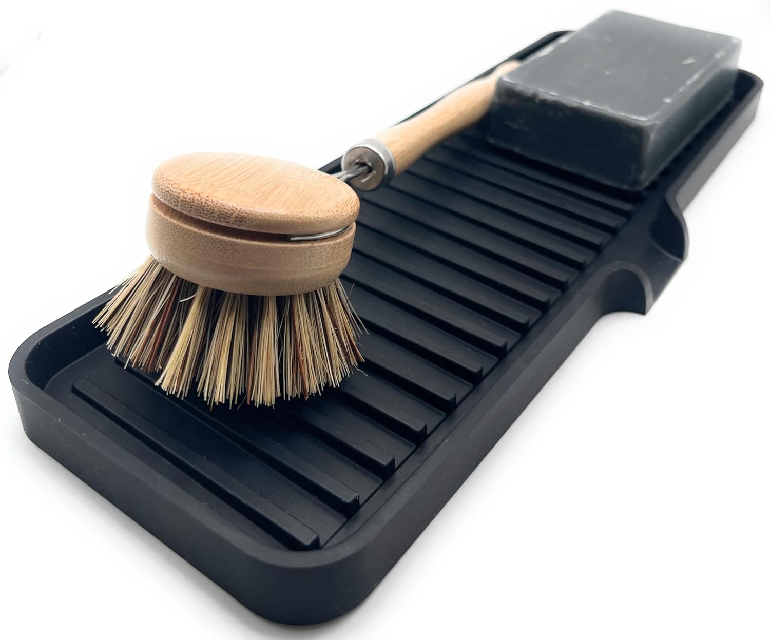 Happitasa Silicone Soap Dish Tray and Sponge Holder with Drain Chute | Bathroom and Kitchen Sink Organizer Caddy (Black, 12"x4", 7.4 Ounces)