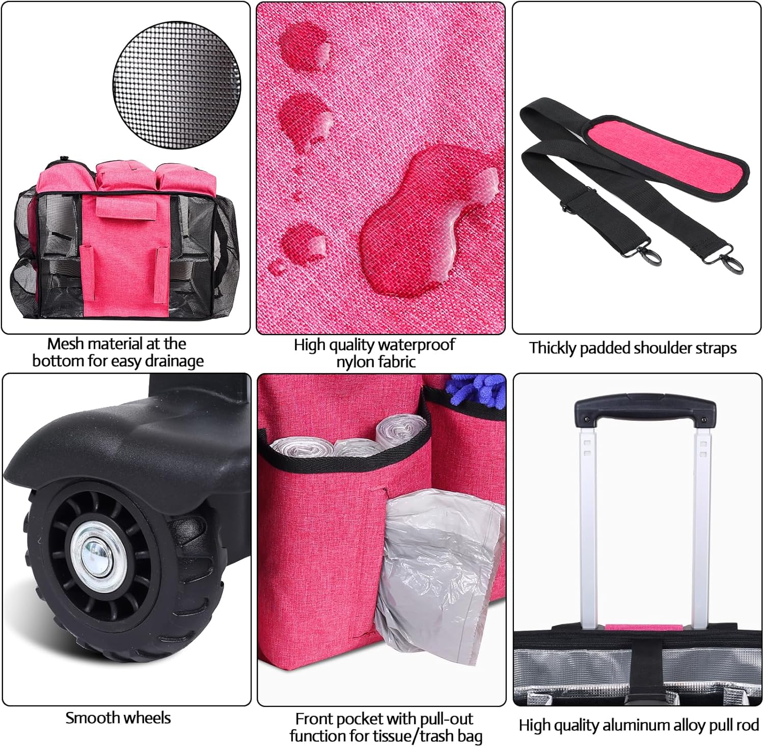 Extra Large Rolling Cleaning Caddy Bag with Detachable, Foldable Trolley Portable Cleaning Cart for Housekeeping Cleaning Caddy with Adjustable Shoulder Strap and Multiple Storage Pockets
