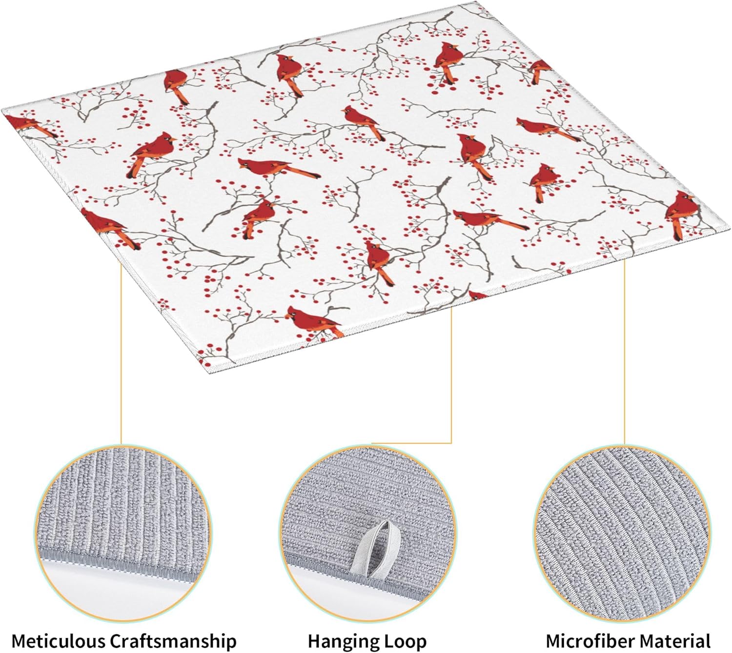 Cardinal Bird Red Berry Decor Kitchen Drying Mat Cute Microfiber Dish Drainer Mat for Kitchen Counter Absorbent Reusable Washable Home Holiday Decor 16x18 Inch