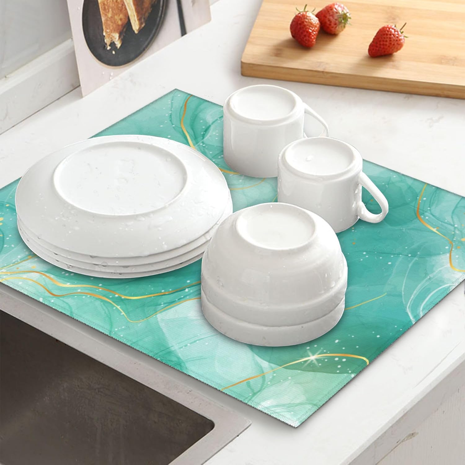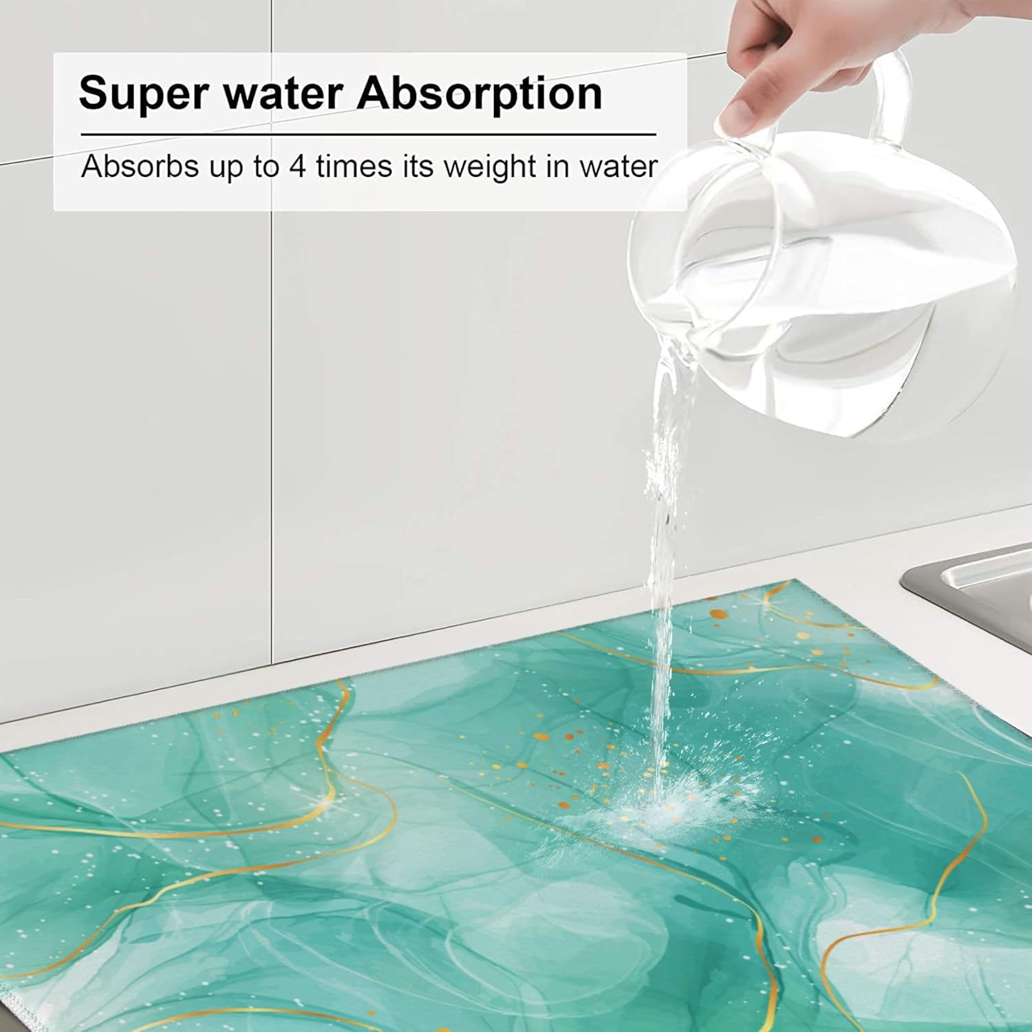 Teal Gold Marble Dish Drying Mat for Kitchen Counter Green Turquoise Dish Drainer Rack Mats 16x18 Inch Absorbent Reversible Modern Drying Pad