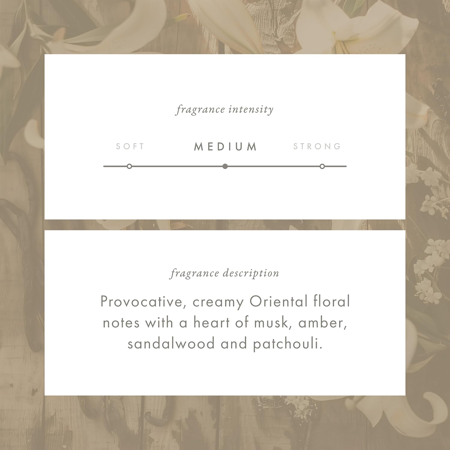 - Scent : Vanilla Woods