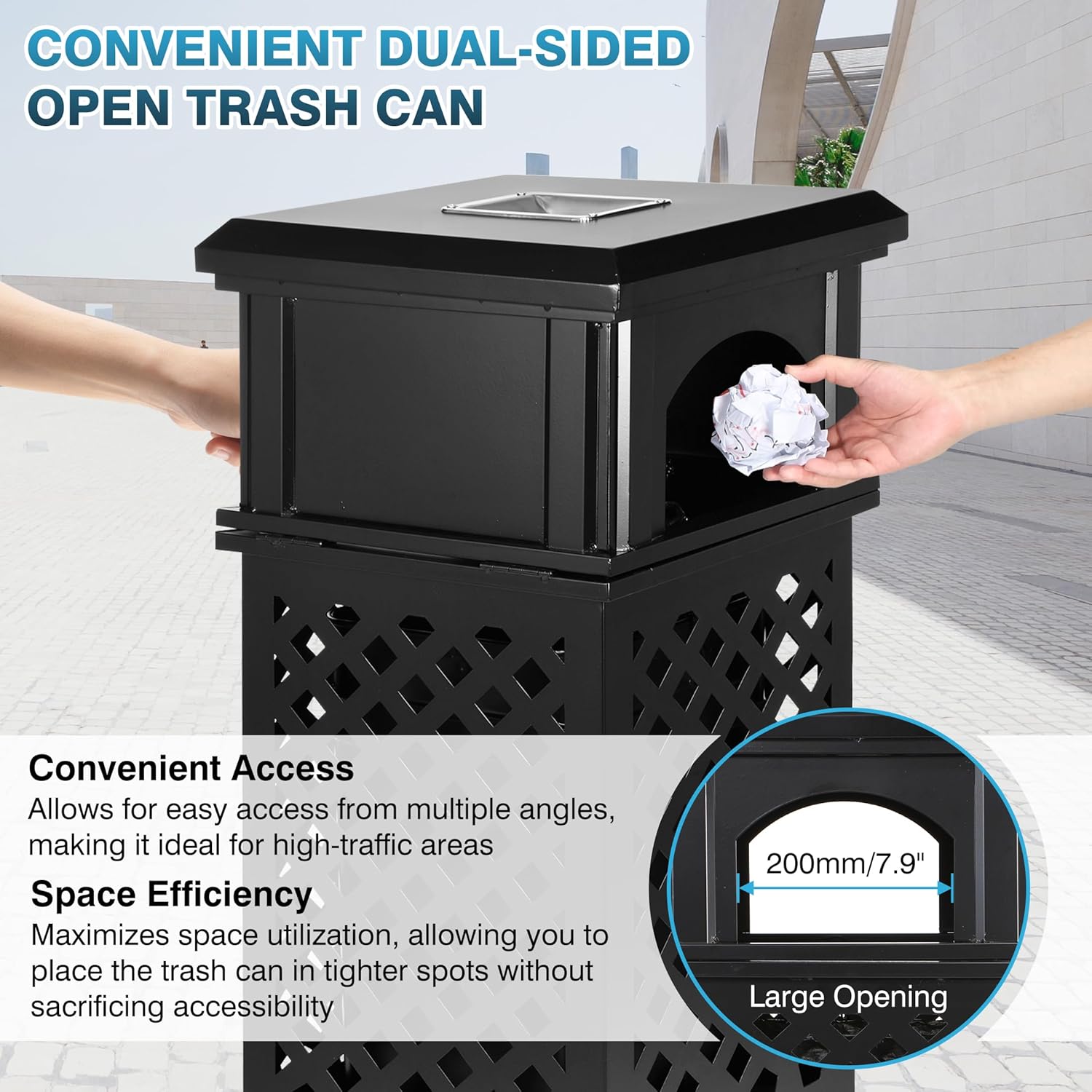 - 【Versatile Waste Container】 With super large dual-side opening and an integrated ash urn on the top lid, this outdoor trash receptacle serves as a versatile combination of an ashtray and a waste receptacle. This thoughtful design allows for convenient, hands-free disposal of cigarettes and trash in one place while effectively separating cigarette butts from other waste, reducing fire risks.