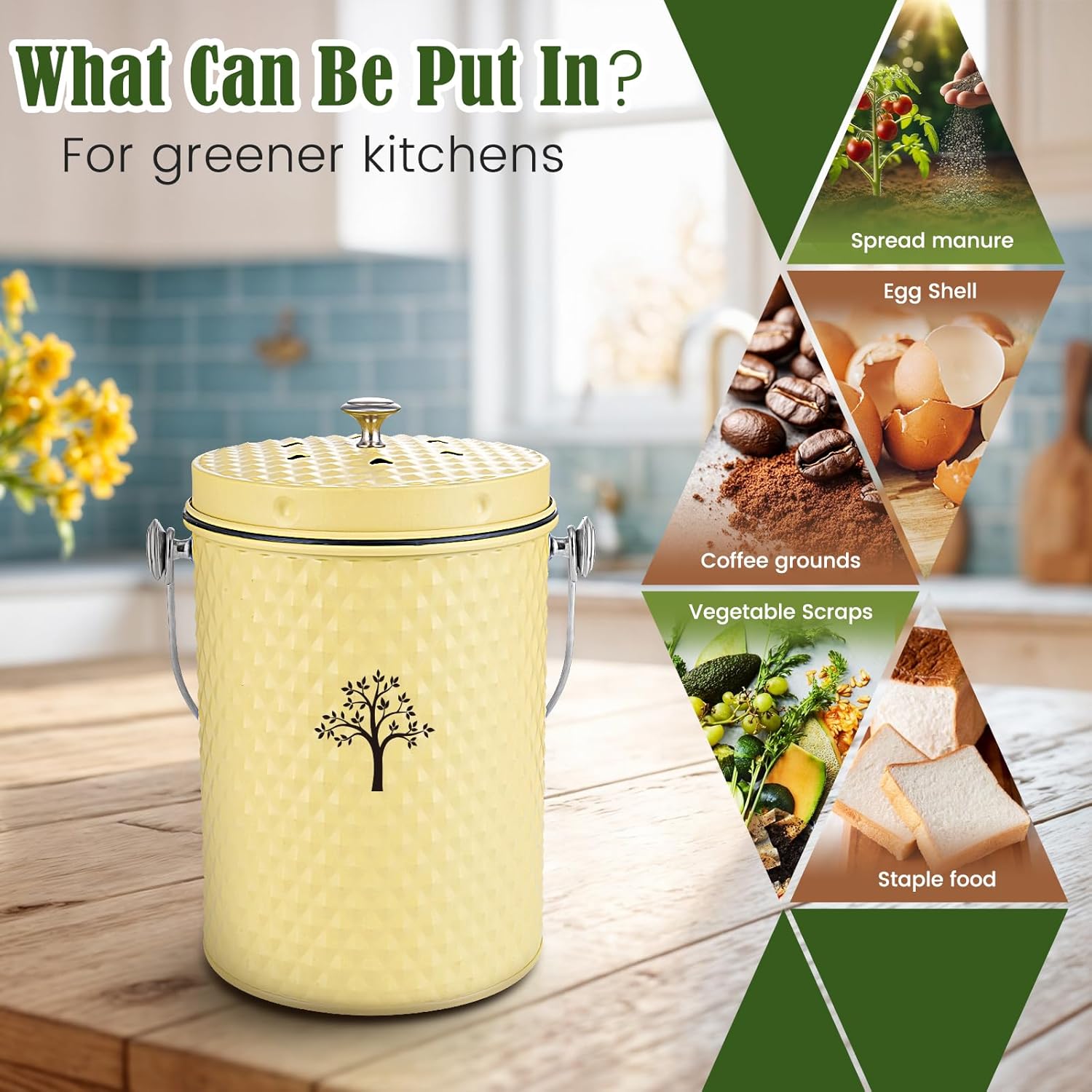 - 【ENVIRONMENTALLY FRIENDLY COMPOSTING】:The compost bin is the perfect odorless storage container for organic kitchen waste in your home.It will complement any kitchen decor.Put kitchen waste into outdoor organic fertilizer for composting and reuse. Not only does it make a stylish decoration, but it’s also functional and great for a greener environment.