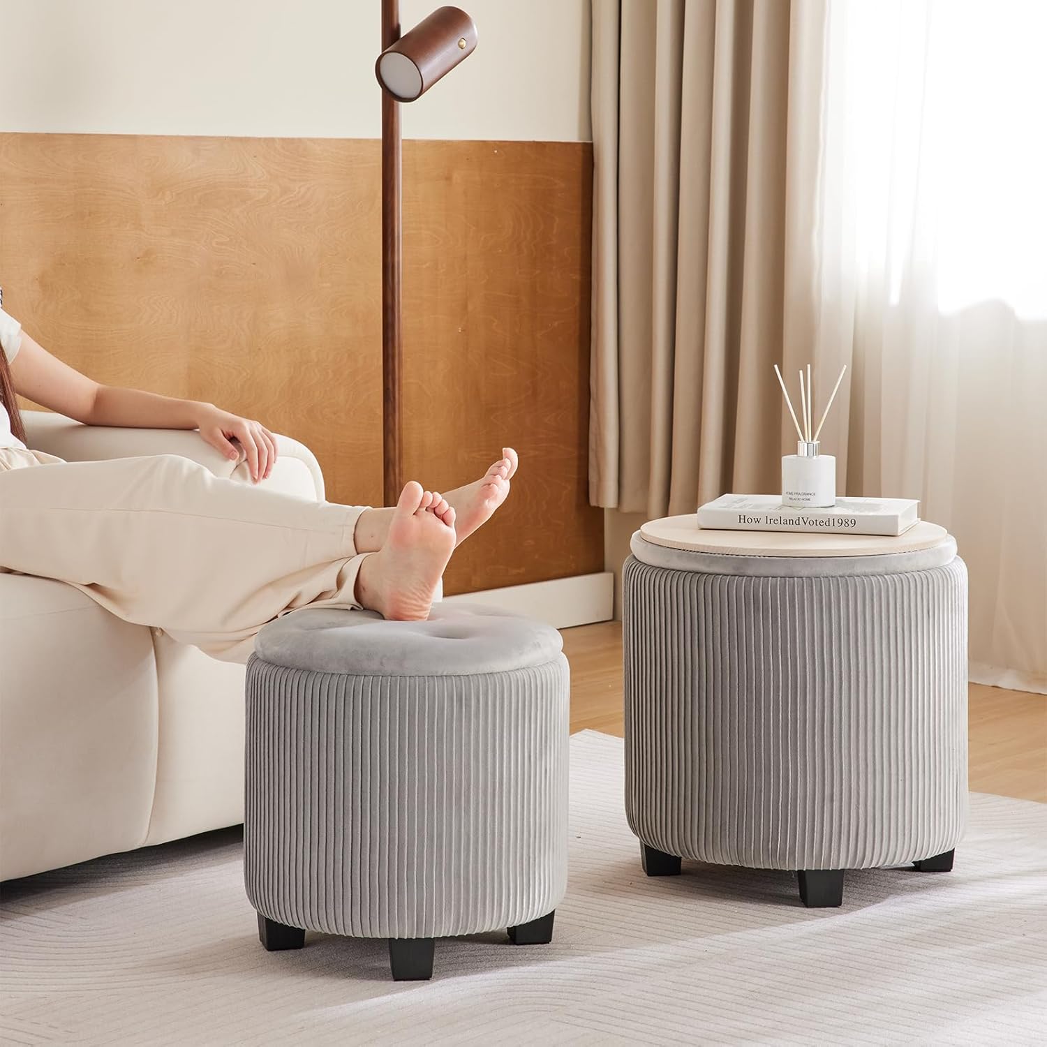 Big Round Ottoman with Storage Set of 2,Upholstered Velvet Vanity Stool for Makeup Multifunctional Foot Rest Coffee Table Padded Seat Tufted Ottomans for Living Room&Bedroom (Grey)