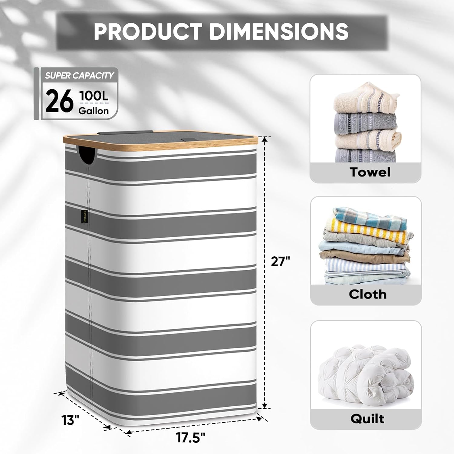 BALEINE Laundry Hamper with Lid, Tall Laundry Baskets with Bamboo Pull Handles, Large Laundry Bin with Internal Support (26 Gal/100L, Grey Stripe)