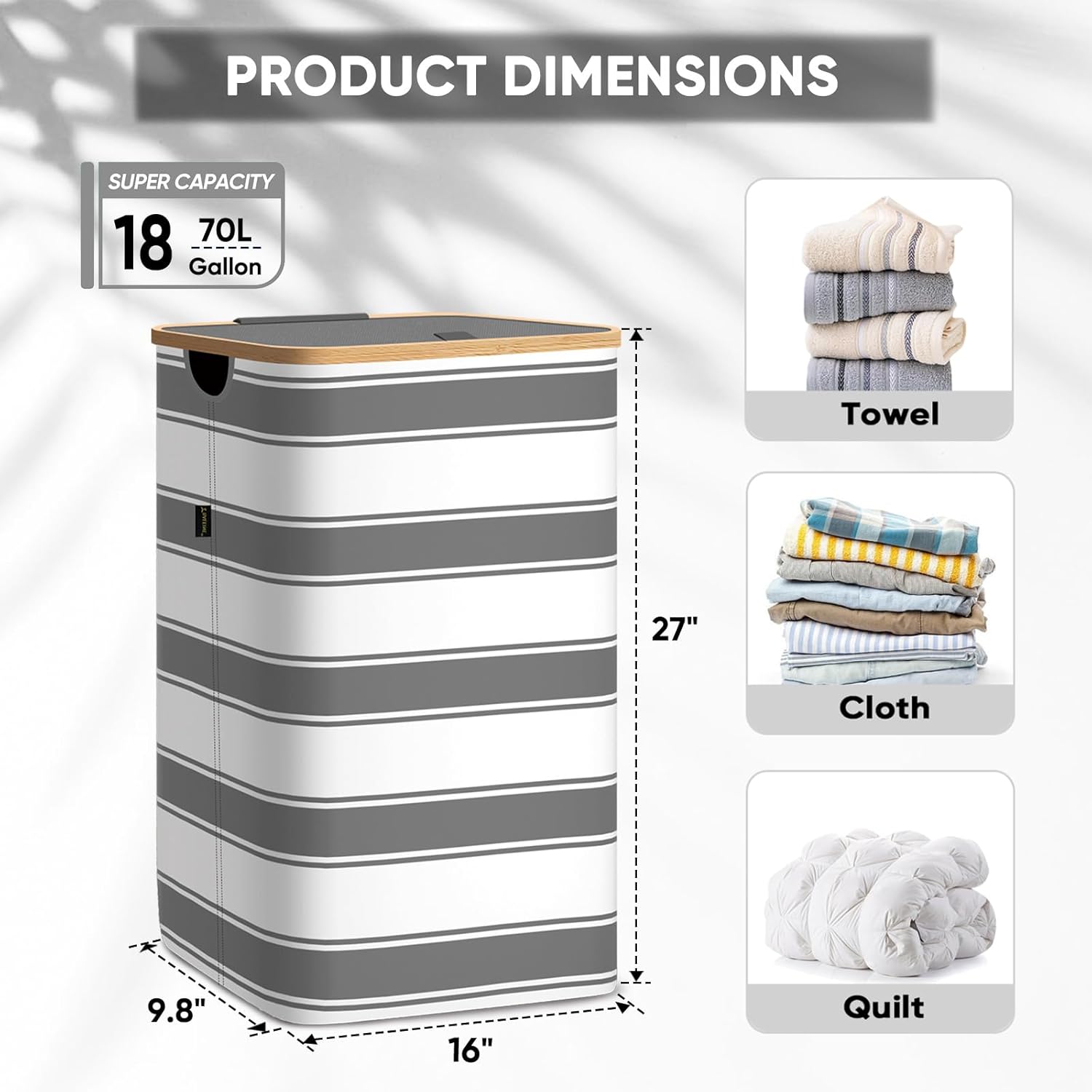 BALEINE Laundry Hamper with Lid, Tall Laundry Baskets with Bamboo Pull Handles, Large Laundry Bin with Internal Support (18 Gal/70L, Grey Stripe)