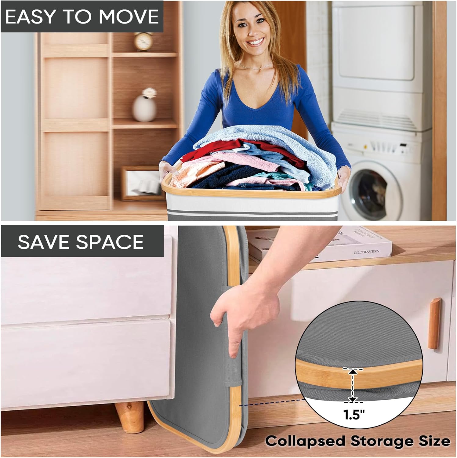 - [DURABLE AND ECO-FRIENDLY] We care about the environment, which is why our laundry hamper is made from sustainable bamboo rim. Bamboo is known for its exceptional strength and durability, ensuring this clothes hamper's handle will withstand the test of time. By choosing our eco-friendly laundry basket organizer, you're making a conscious decision to reduce your carbon footprint.
