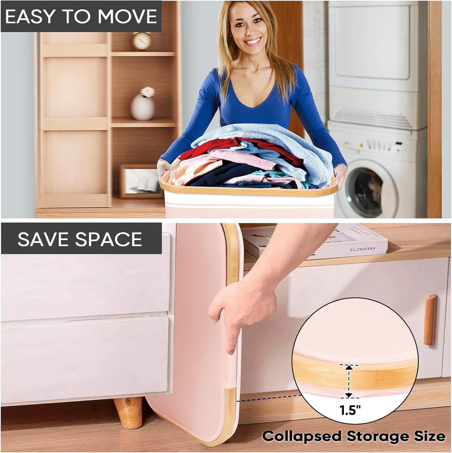 - [DURABLE AND ECO-FRIENDLY] We care about the environment, which is why our laundry hamper is made from sustainable bamboo rim. Bamboo is known for its exceptional strength and durability, ensuring this clothes hamper's handle will withstand the test of time. By choosing our eco-friendly laundry basket organizer, you're making a conscious decision to reduce your carbon footprint.