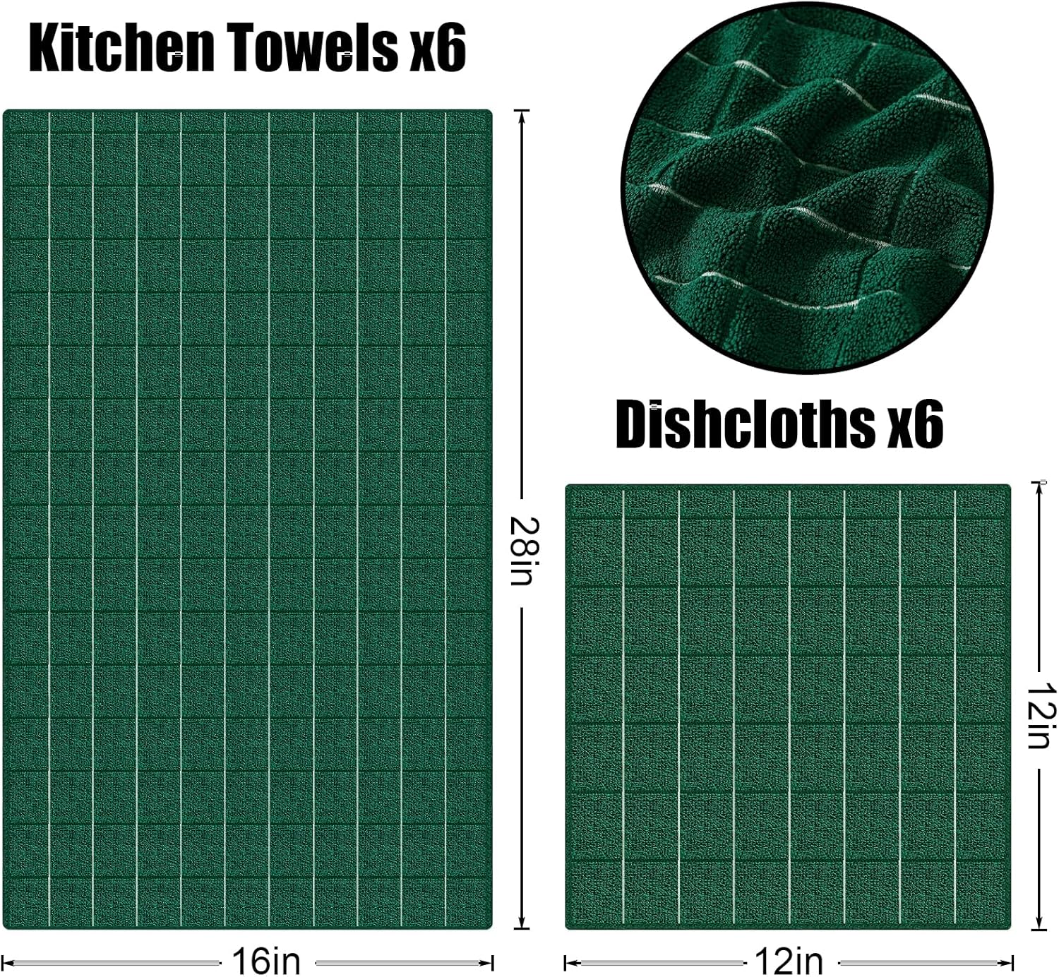 Homaxy Microfiber Kitchen Towels and Dishcloths Set, 12 Pack Soft and Absorbent Dish Hand Towels Bulk, 28 x 16 Inch & 12 x 12 Inch Quick Drying Rags for Washing Dishes, Dark Green