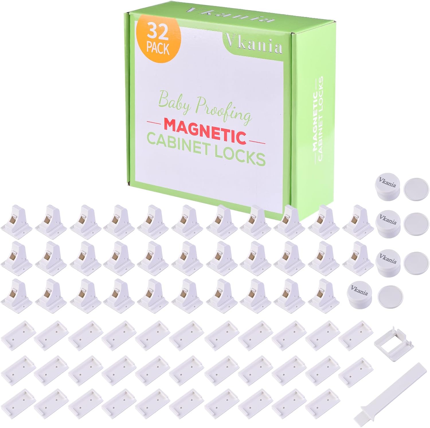 - [ 32 LOCKS + 4 KEYS ] Vkania magnetic cabinet locks are perfect for baby proofing cabinets and drawers. These child proof cabinet locks feature a strong magnetic design to keep curious toddlers and pets out. Easy to install with 3M adhesive—no tools, drilling, or holes required. Ideal for baby safety locks for cabinets in kitchens, bathrooms, and more.
