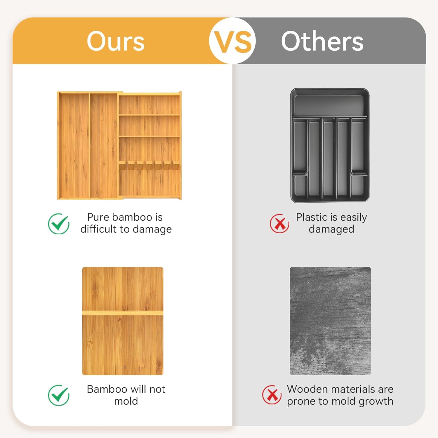 - 【Pure Natural Bamboo Utensil Drawer Organizer】: Our kitchen drawer organizer is made of naturally regenerated bamboo, and the entire silverware drawer organizer is made of pure bamboo material. Bamboo material is not as easily damaged as plastic silverware drawer organizer, nor as moldy as wooden cutlery boxes, making it the best helper in the kitchen