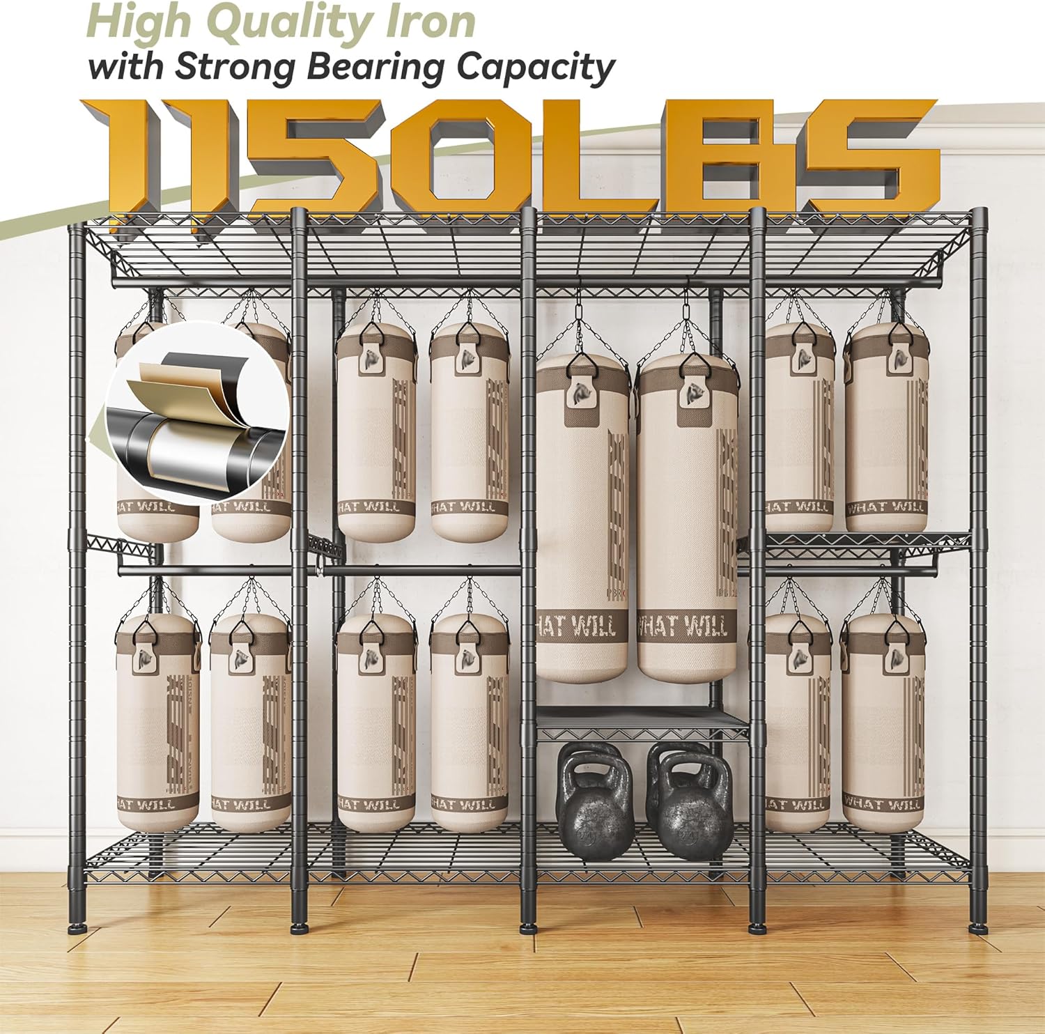- 【1150LBS Clothing Rack】The heavy duty clothes rack has 6 shelves and 5 hangers. Single hanging rod can support up to 77LBS, the longest hanger can hold 132LBS. Each shelves can hold up to 88LBS, which can hold at least 2 24" suitcases.