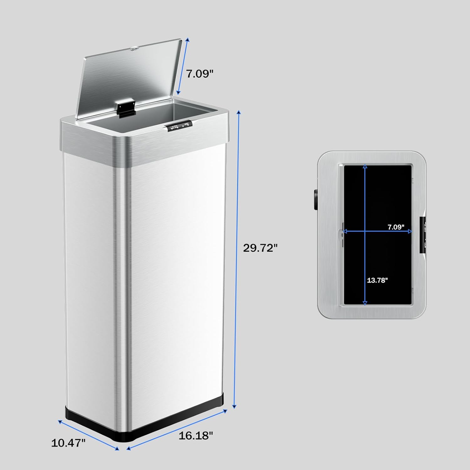 - 【Soft-Close Lid and Integrated Design】Sensor trash can lid has a slow-closing function, ensuring each closure is gentle and quiet, reducing noise and disturbance to nearby people while also enhancing the trash can's sealing ability. Trash can opening measures 13.78 × 7.09 inches, making it easy to deliver even large items
