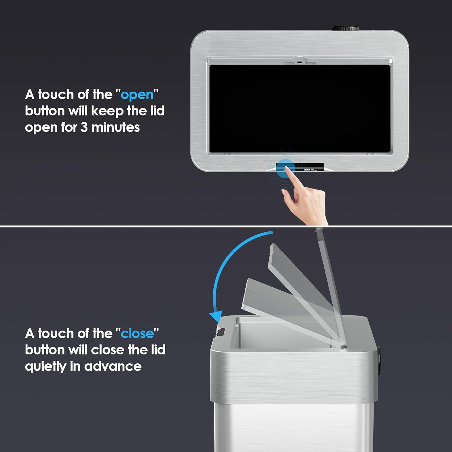 - 【Sensing and Button Mode】Automatic trash can has sensing area of up to 5.9 inches and can detect motion in just one second to open. It will automatically close after nine seconds. If you need trash can to remain open for extended time, you can touch the "open" button to keep it open for three minutes. Touching the "close" button allows you to close trash can immediately without waiting