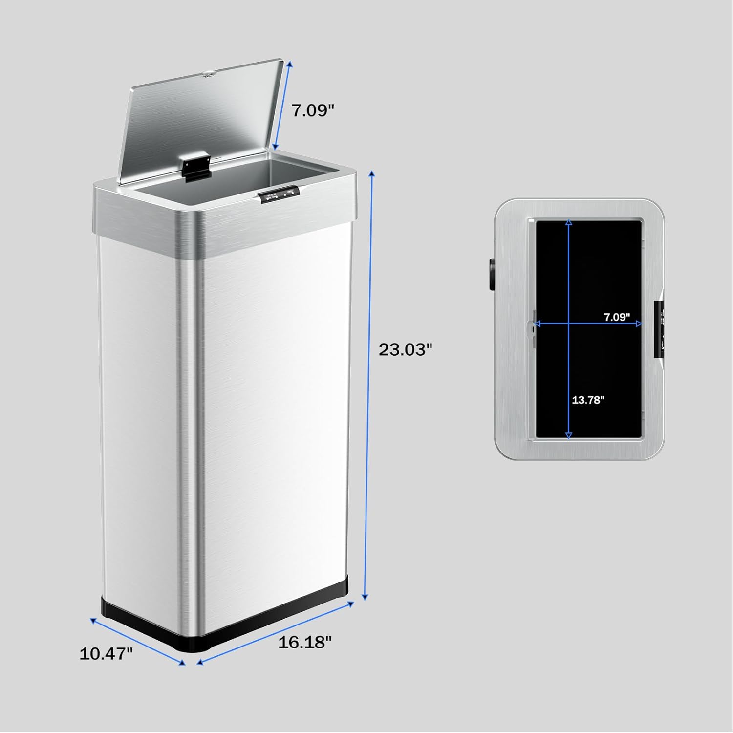 - 【Soft-Close Lid and Integrated Design】Sensor trash can lid has a slow-closing function, ensuring each closure is gentle and quiet, reducing noise and disturbance to nearby people while also enhancing the trash can's sealing ability. Trash can opening measures 13.78 × 7.09 inches, making it easy to deliver even large items