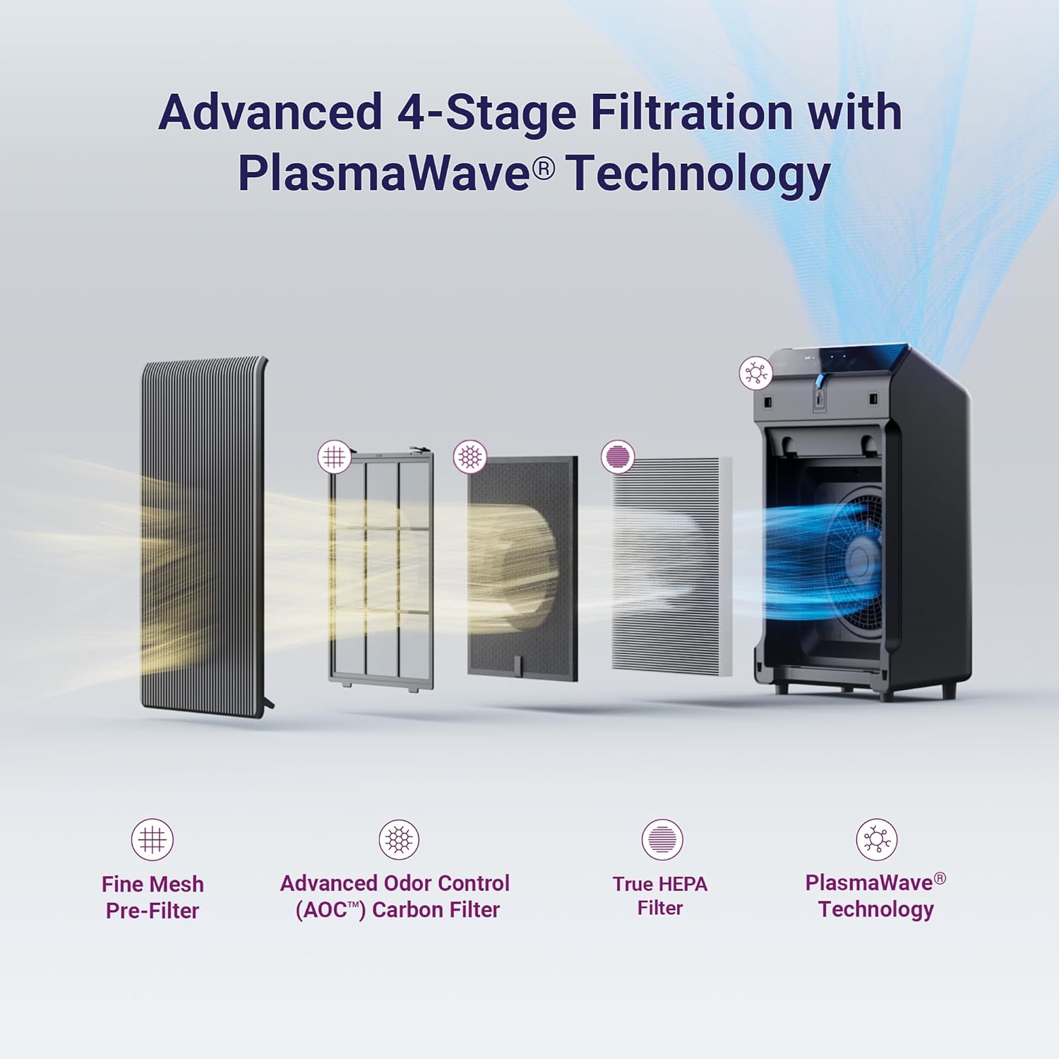 - 𝐀𝐝𝐯𝐚𝐧𝐜𝐞𝐝 𝐎𝐝𝐨𝐫 𝐂𝐨𝐧𝐭𝐫𝐨𝐥 𝐂𝐚𝐫𝐛𝐨𝐧 𝐅𝐢𝐥𝐭𝐞𝐫: Reduces VOCs and household odors from cooking, pets, and smoke. It is designed to catch airborne particles found indoors, which also helps prolong the True HEPA Filter life