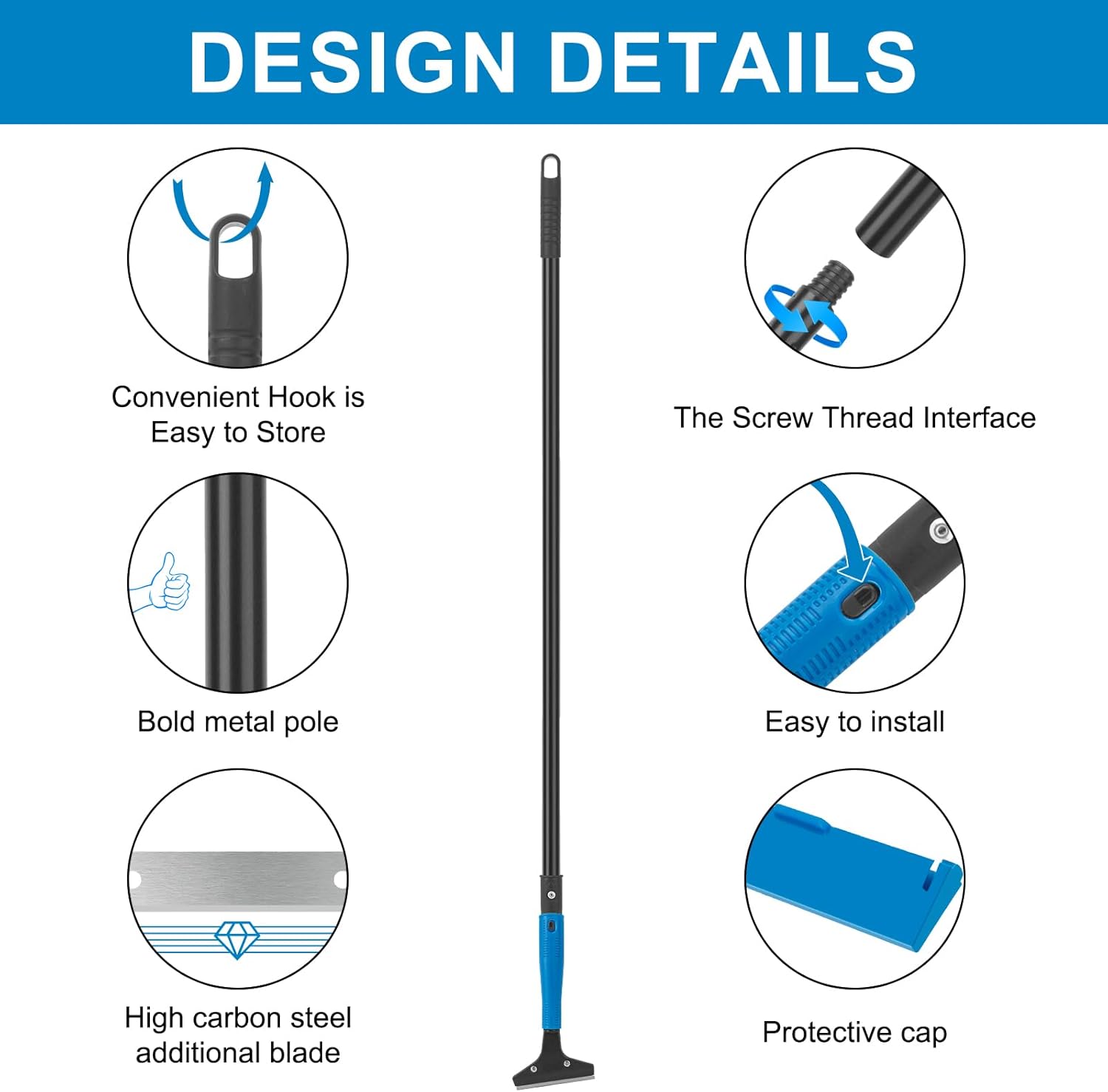- ๐The 4" wide blade cleans a larger area than other mini scrapers, 45.7" long handle saving effort and improving cleaning efficiency,10 replacement blades, safety cap, and screwdriver are also provided.