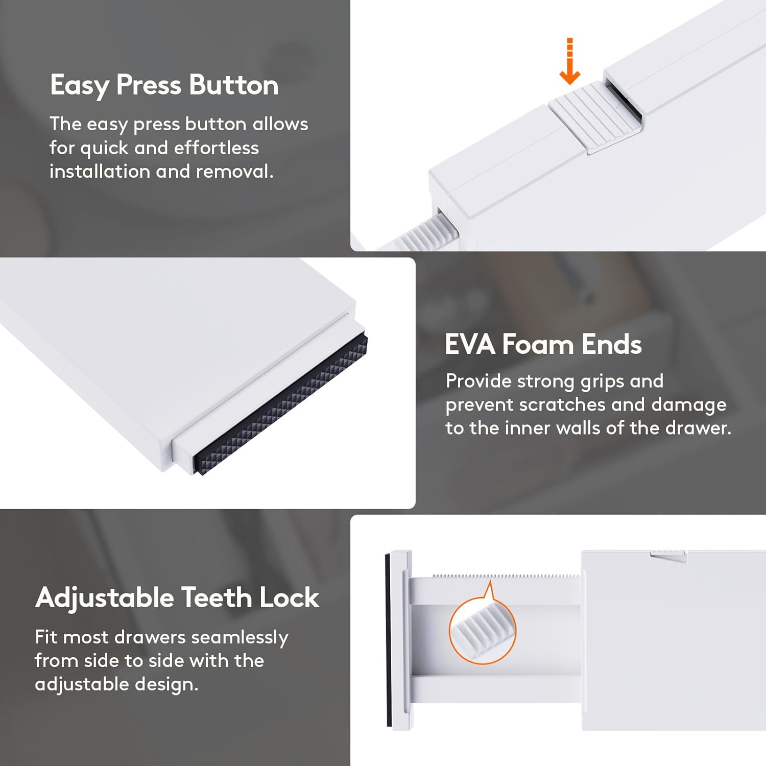 - Easy to Install: Press the top button and stretch to the desired length, then fully extend again to secure in place; The strong spring tension keeps each drawer organizer securely upright; To retract, press the top button and push the stretched side