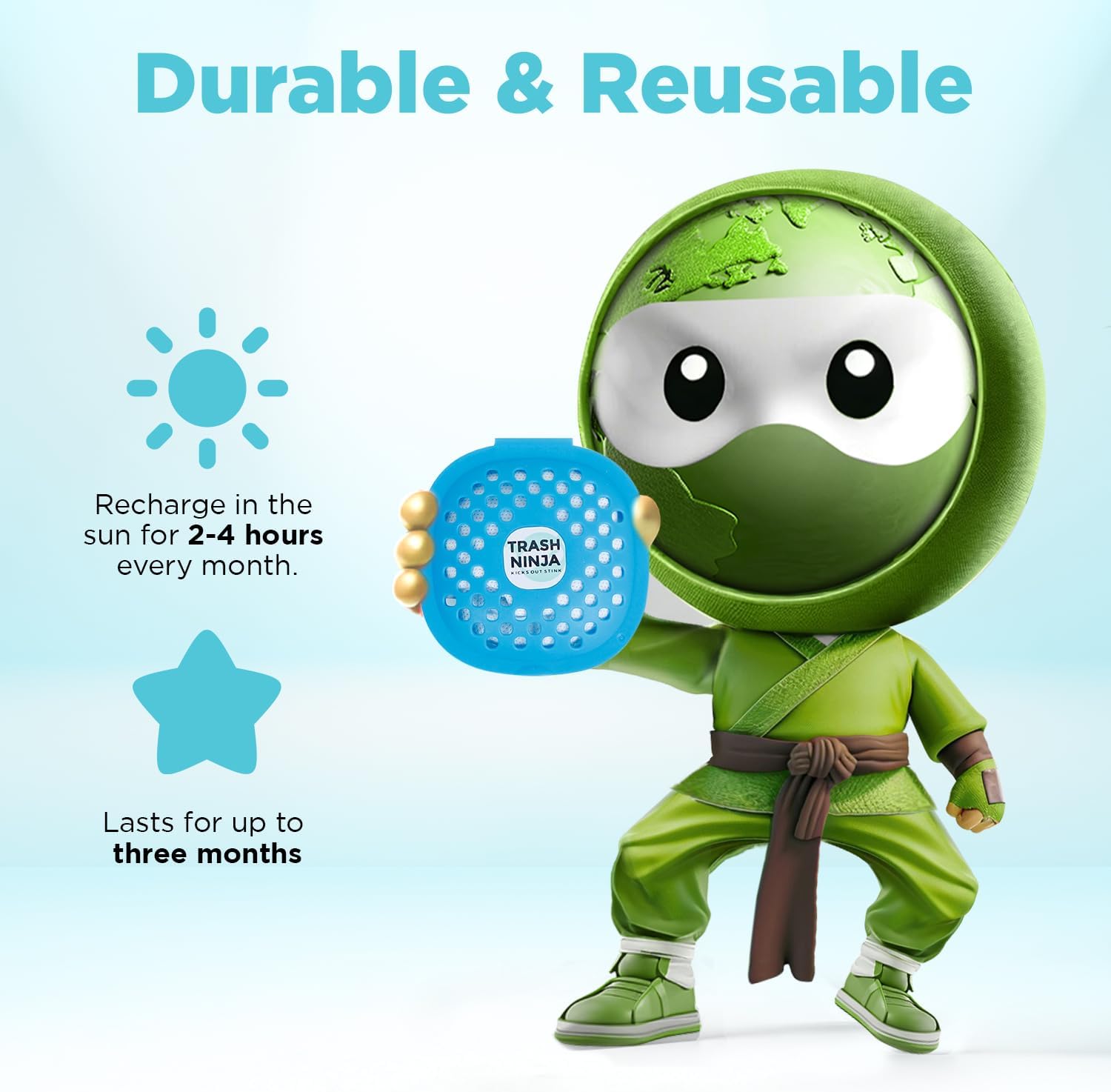 - SIMPLE AND EASY TO USE: Stick the trash can smell eliminator to the lid, and let it work. Recharge monthly in sunlight for up to 3 months of freshness, saving you time and money!