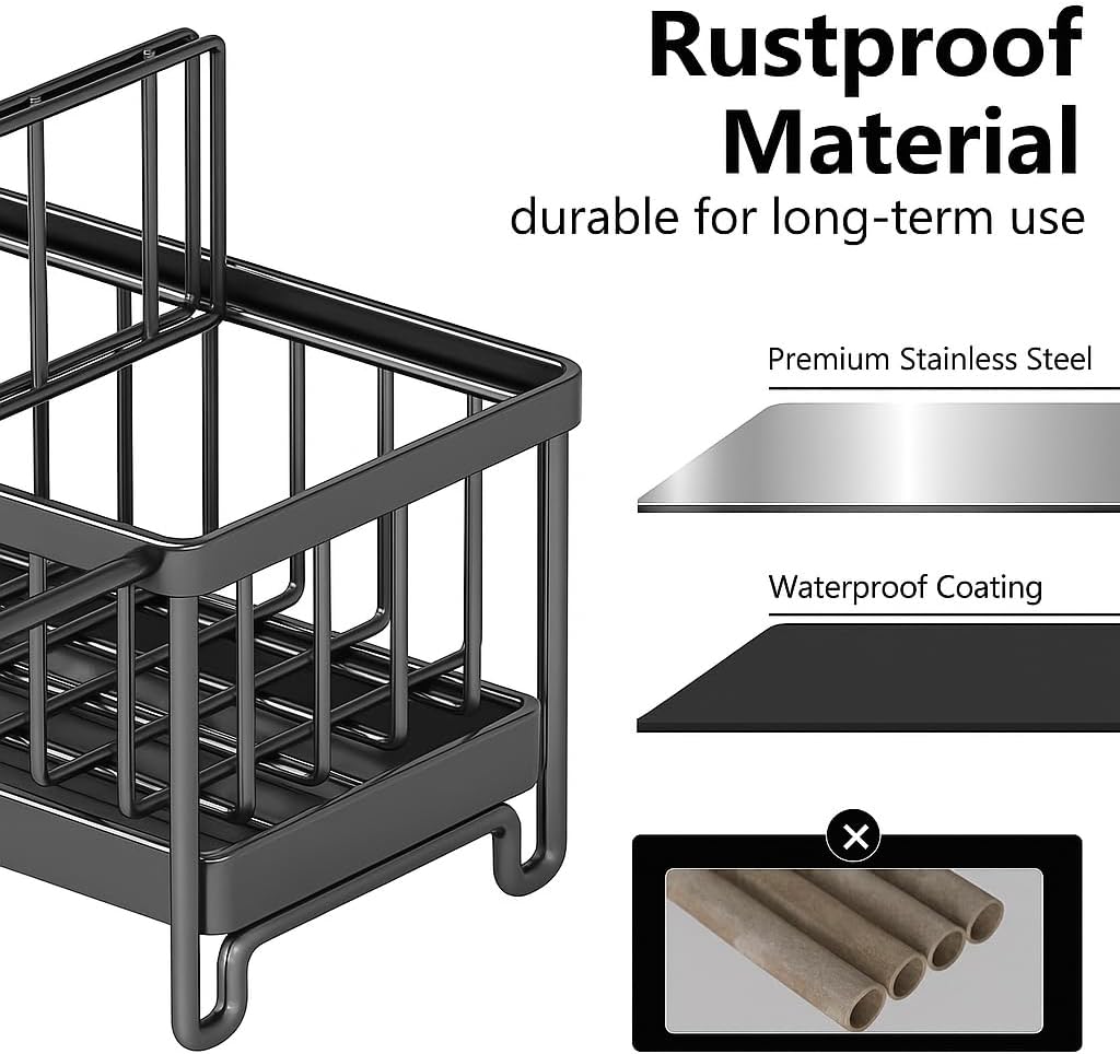 - DURABLE & RUSTPROOF STAINLESS STEEL – Built from premium stainless steel, this sponge caddy for kitchen sinks resists rust and deformation. It’s long-lasting, sturdy, and easy to clean—just rinse under water. A great addition to your kitchen sink accessories and organization.
