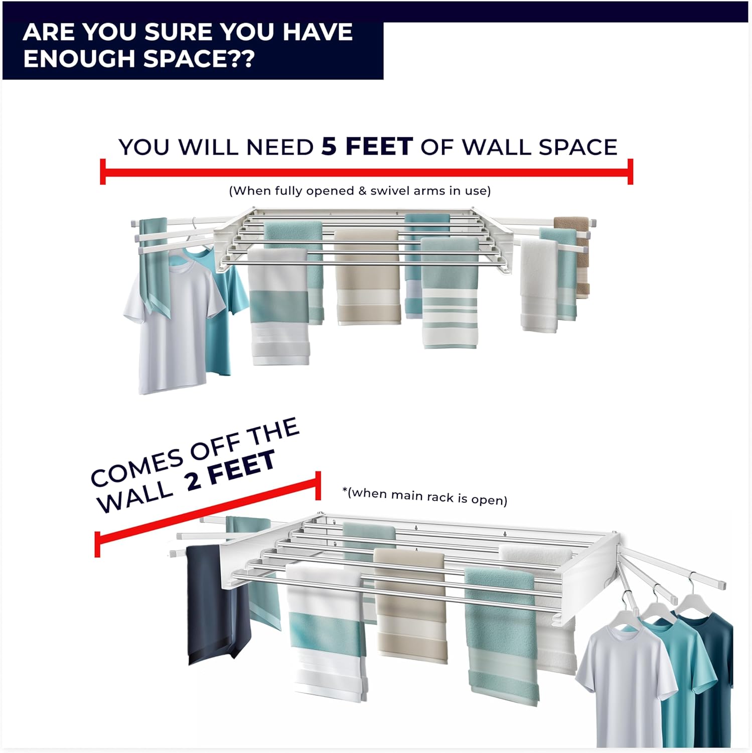 MODERN-X Wall Mounted Clothes Drying Rack with 6 Swivel arms, 35โWide, 26 Linear ft of Laundry Drying Rack Space, 6 Collapsible Aluminum rods, 2X Drying Capacity, Space Organizer Holds up to 60lbs