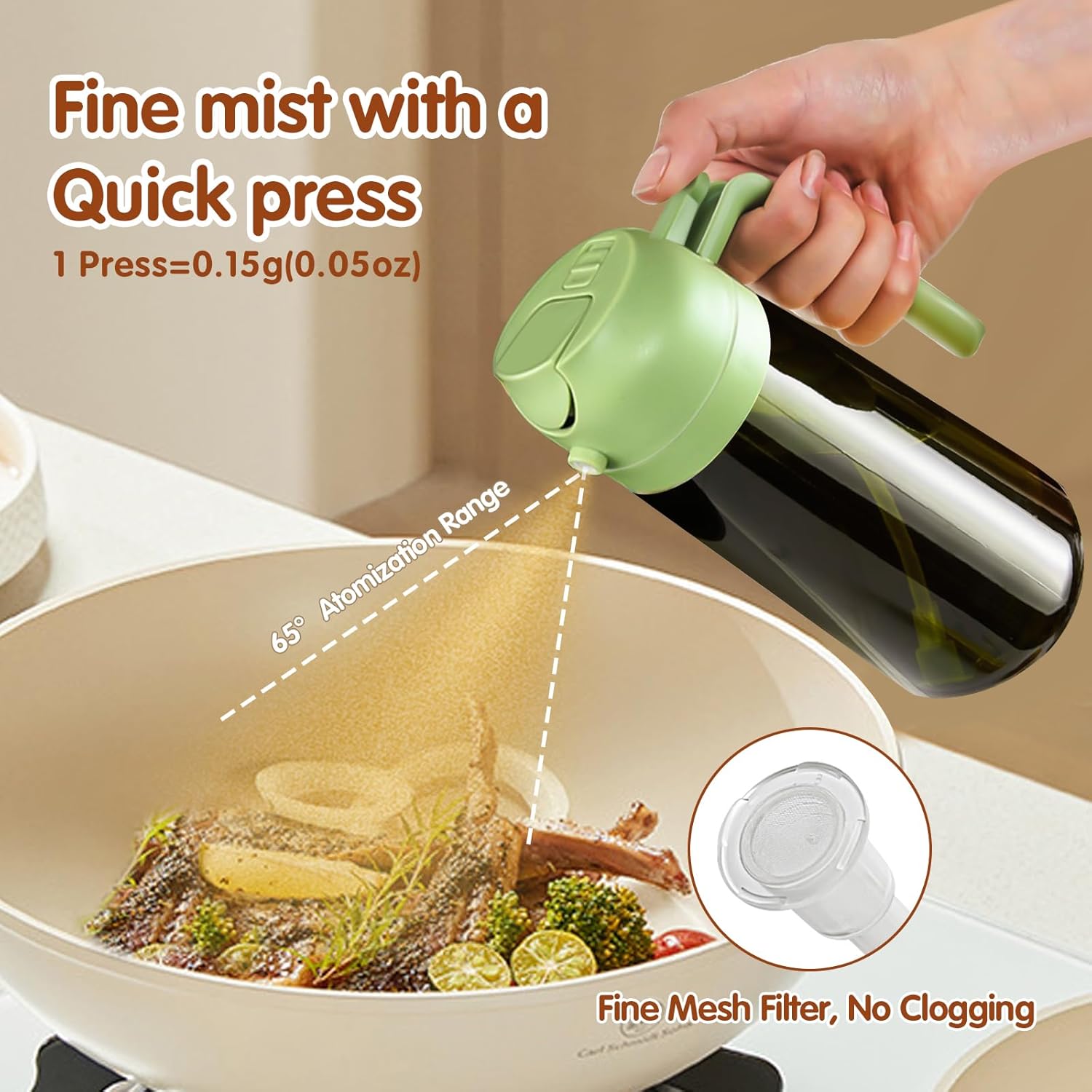 - 【Precise Oil Control】: 2 in 1 oil dispenser and oil sprayer can help to control the amount of oil while pouring or spraying. Each spray dispenses approximately 0.2 grams of oil, which is easily to control and measure your daily oil intake