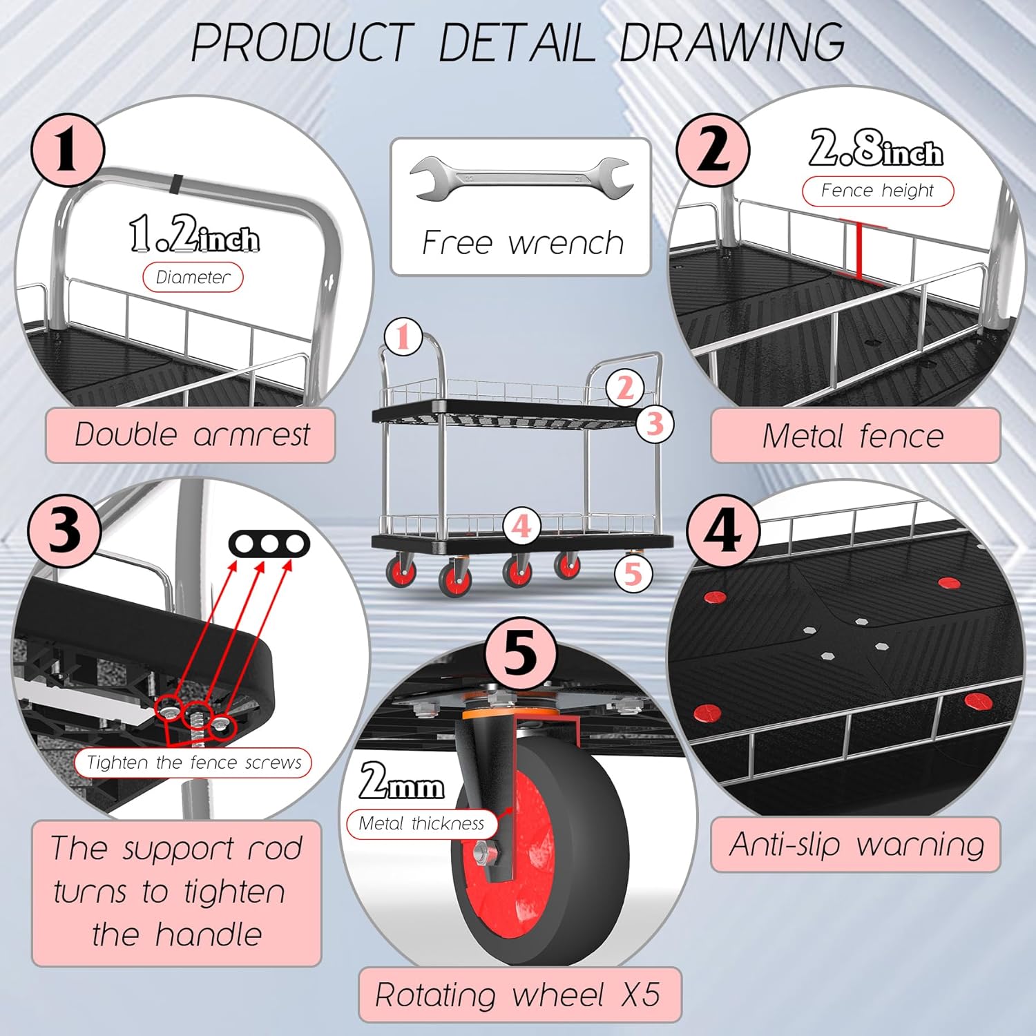 - 【Double Layer Design】 The platform of the cart is made of 2 pieces of brand-new plastic materials. The new double-layer cart consists of support rods connected. The design of double handrails and 5 rotating wheels improves the convenience in the use process. The detachable fence on the side can transport articles of different sizes. the textured platform surface help prevents cargo from slipping off the cart. It is a practical tool cart in life