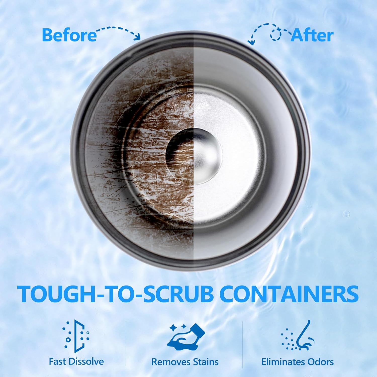 - Quick And Easy&No Scrubbing Required: The bottle clean tablet starts cleaning instantly after contact with water. Natural water bottle cleaning tablets can perfectly clean any stainless steel water bottle, coffee tumbler, glass water bottle, cup, water bladders, baby bottle, hard to clean plastic containers and more.