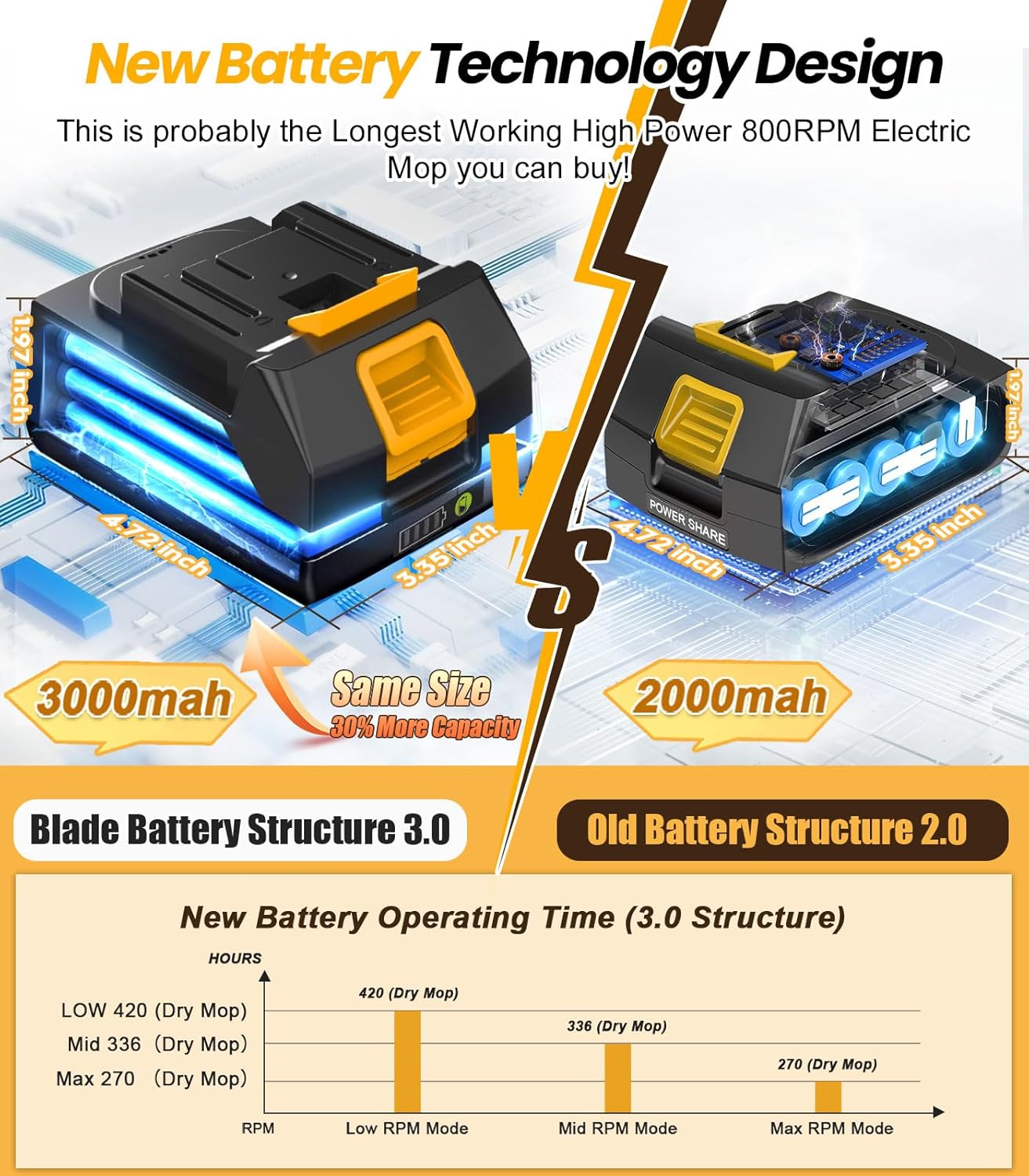 - ใ๐๐๐ฌ๐ญ ๐๐๐ซ๐ญ๐ข๐๐ข๐๐+ ๐,๐๐๐๐ฆ๐๐ก ๐๐๐ซ๐ ๐ ๐๐๐ญ๐ญ๐๐ซ๐ฒ ๐๐ง๐ ๐๐ก๐๐ซ๐ ๐ข๐ง๐ ๐ญ๐ข๐ฆ๐ใThis is probably the Longest Working 800RPM power mop you can buy! The latest technology 3.0 blade compression construction battery is the same size and has 30% more capacity compared to the old 2.0 construction battery. 2.5 hours to fully charge,two batteries can work continuously for 420 minutes (low speed mode). Enough time to deep clean floors, bathrooms, and everywhere in your house