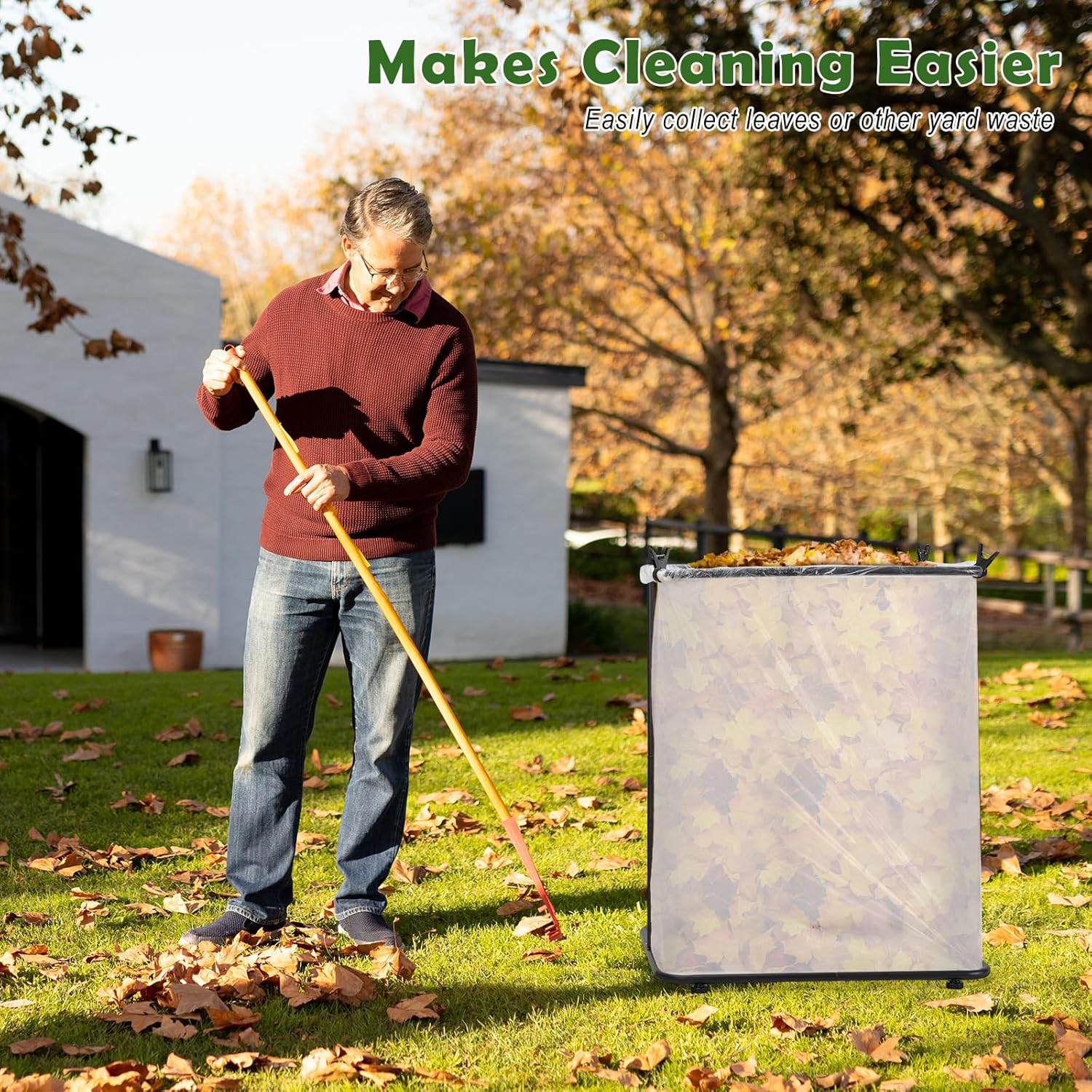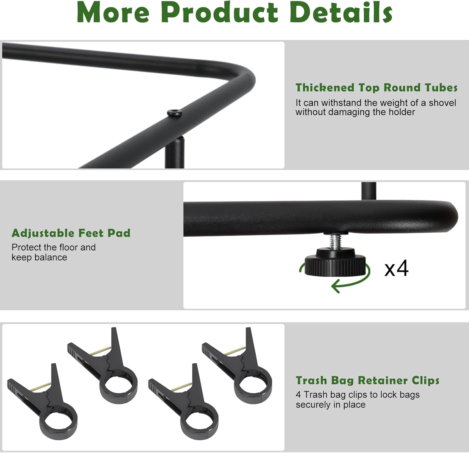 - 【Convenient Garbage Bag Holder】This trash bag holder is specially designed for collecting fallen leaves, weeding the garden, and mowing the lawn. The wide opening keeps the garbage bag open, making it easy to collect raked leaves and clippings. Even when cleaning up alone, it is still very convenient and effortless. It also comes with 4 clips to secure the leaf bag to the camping trash bag holder to prevent the bag from being blown away or slipping off.