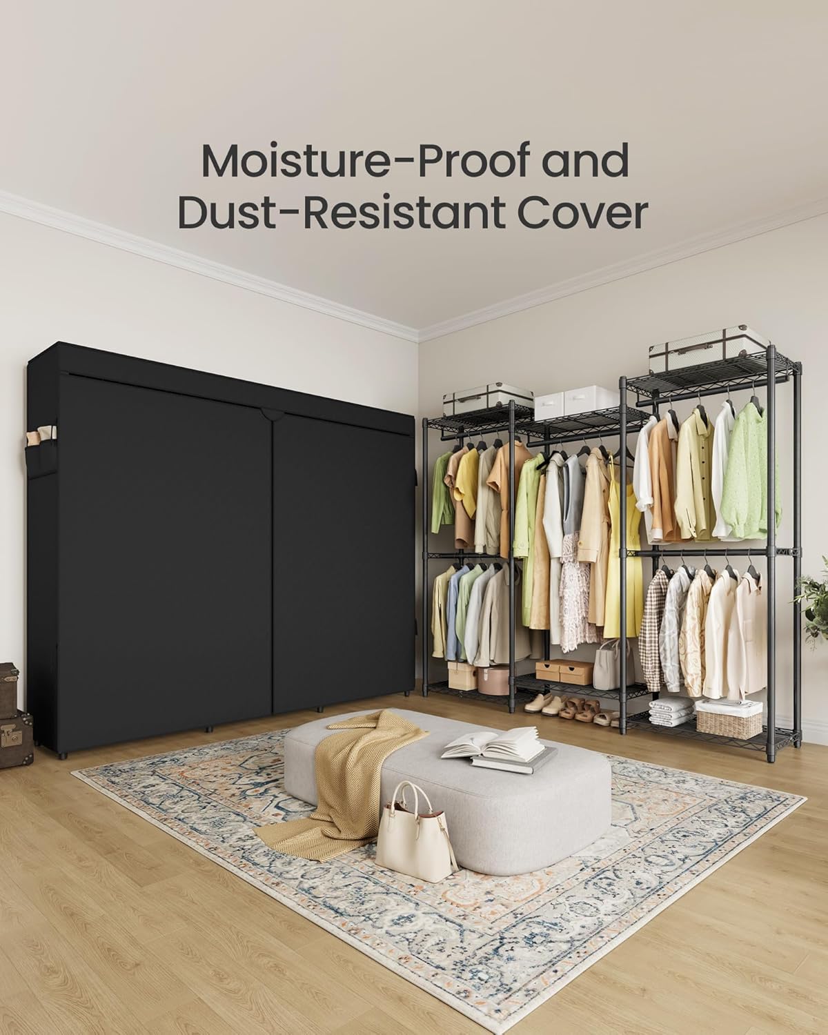 - 【AWAY FROM DUST】Your favorite garments deserve to stay pristine and be better protected. The fabric cover, complete with a zipper and hook-and-loop fasteners, ensures your clothes are stored properly. No more dust worries!