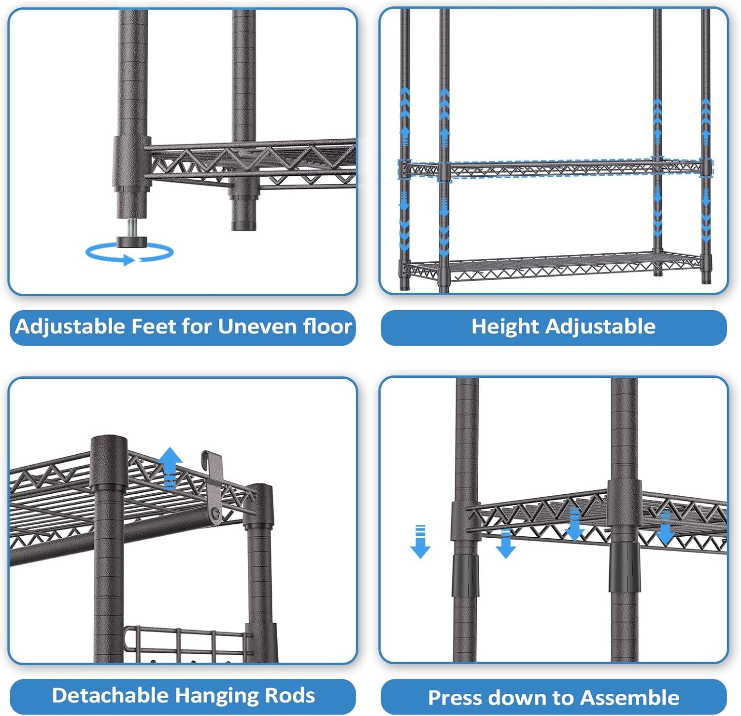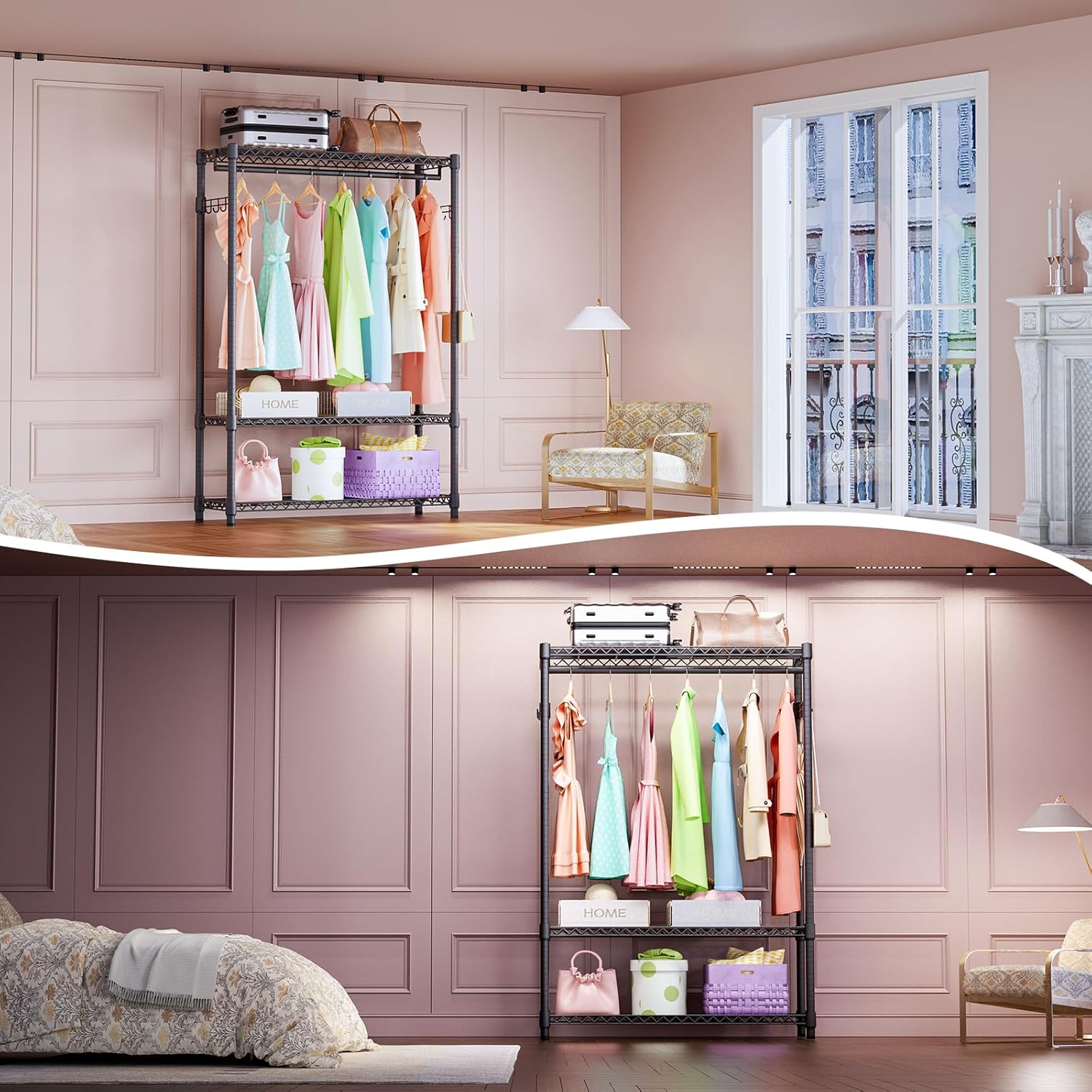 - Height Adjustable: This 3-tier clothing rack features a sturdy hanging rod and two sets of side hooks, offering flexible storage for garments, shoes, and accessories. The adjustable shelves can be repositioned to fit items of varying heights, allowing you to customize your storage layout for hanging clothes, folded garments, or footwear with ease.